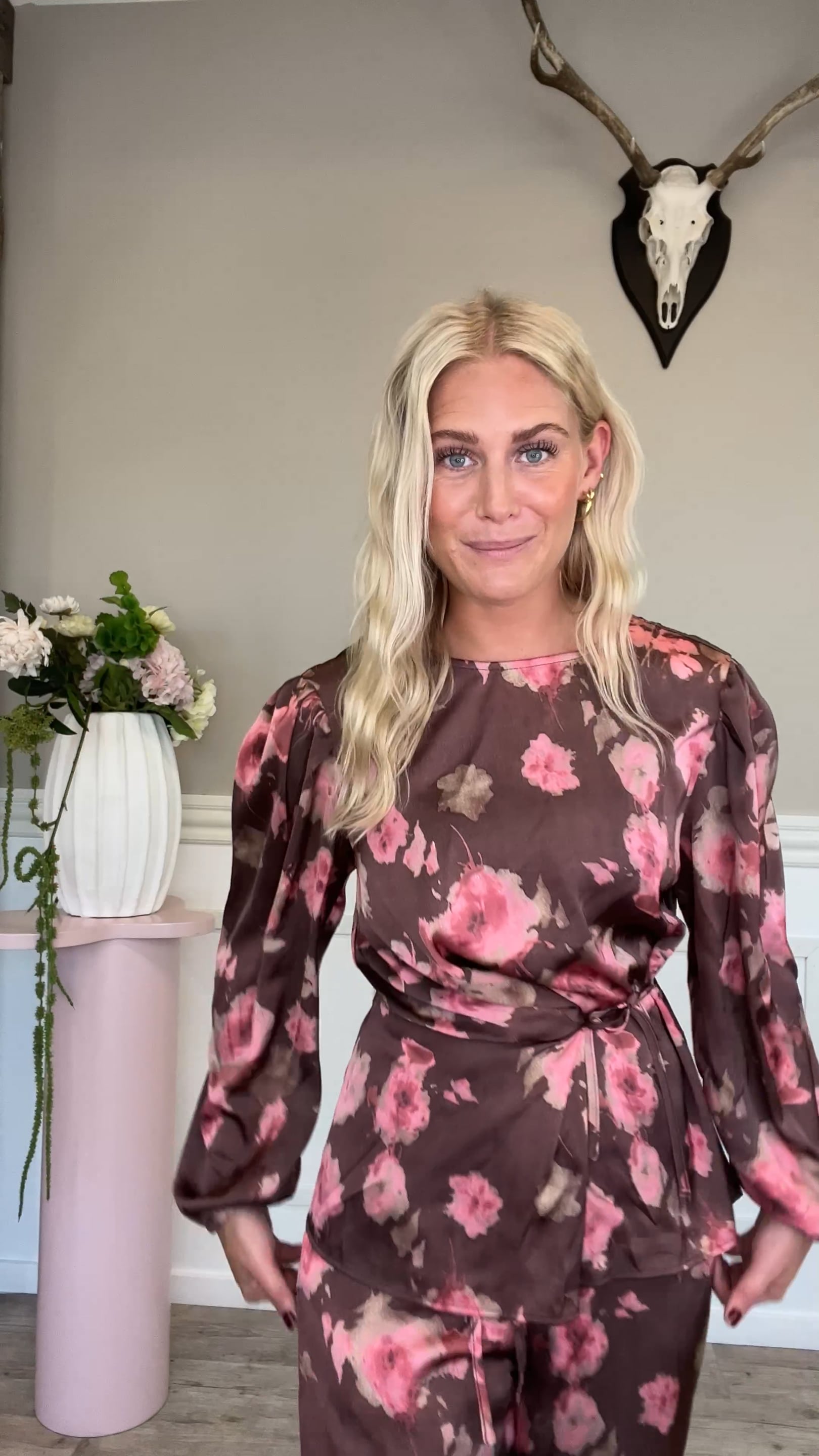 Iiih, se nu lige vores helt eget LYKKE design fra vores eget brand, Loved by Lykke. Den er bare så smuk i den fine bordeaux farve med rosa blomsterprint. Blusen er med "snyde" slå-om der bindes i siden, som tillader dig at justere den lige så den passer præcis dig! Helt perfekt, hvis du spørger os! Blusen lukkes i nakken med en lille knap og har elastikkant ved ærmet der skaber en lille volume. Style blusen til de matchende bukser i samme print eller brug det hver for sig.
