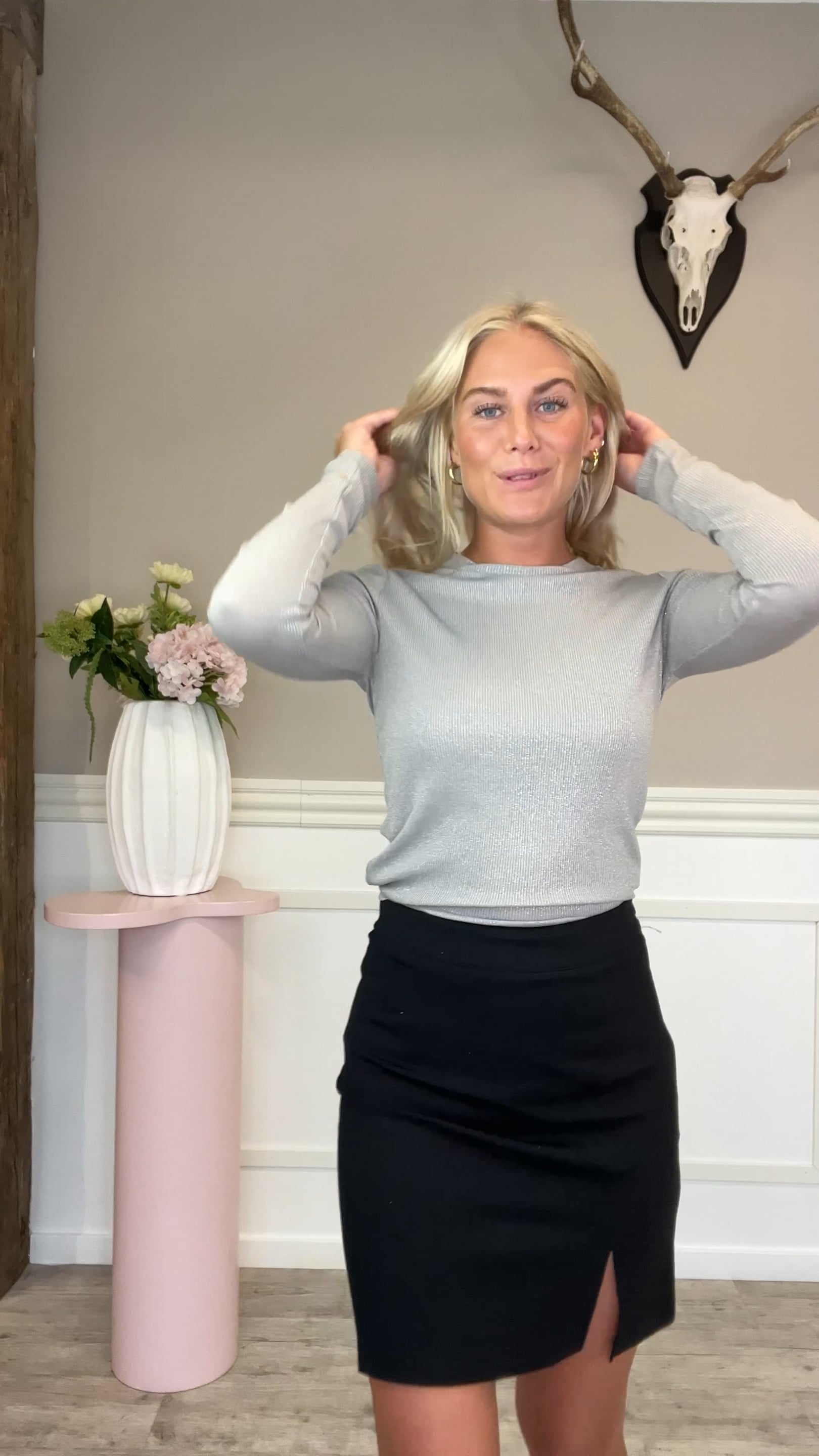En virkelig cool bluse her fra Loved By Lykke, som er i en behagelig ribbet kvalitet. Blusen her har stænk af sølvglitter, hvilket bare giver et mega fedt look. Den er fed til et par jeans eller under en strik!