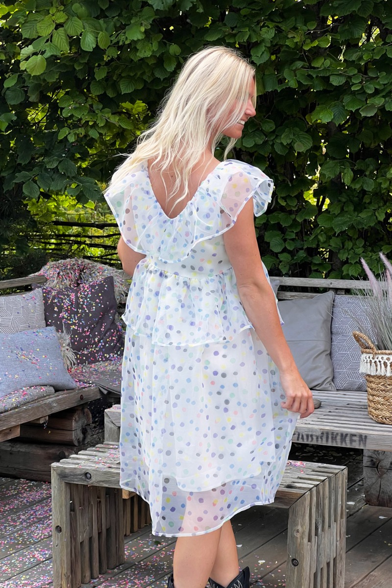Vi har lavet den smukkeste CONFETTI kollektion fra Loved by Lykke og vi er helt forelsket i denne kjole allesammen. Kjolen er inspireret af en kjole alle pigerne her på shoppen nærmest har hængende hjemme i deres garderobe og taget udgangspunkt i at det skulle være et flot, enkelt, feminint og festlig print som vi alle kan bruge. Der må vi altså indrømme vi selv synes vi har ramt plet!
