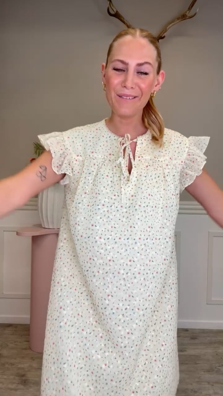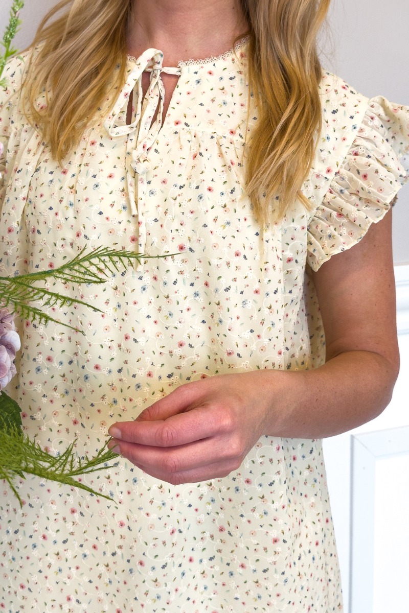 Den absolut sødeste kjole er lige netop landet fra vores eget brand Loved by Lykke! Dene kjole er let og luftig, med fine flæseærmer og den sødeste lille, detaljerede kant ved halsen samt et bindebånd. Kjolen er i en sød og sommerlig smørgul farve og prydet med flotte forårsblomster. Den har desuden to lag, så den er ikke gennemsigtig!