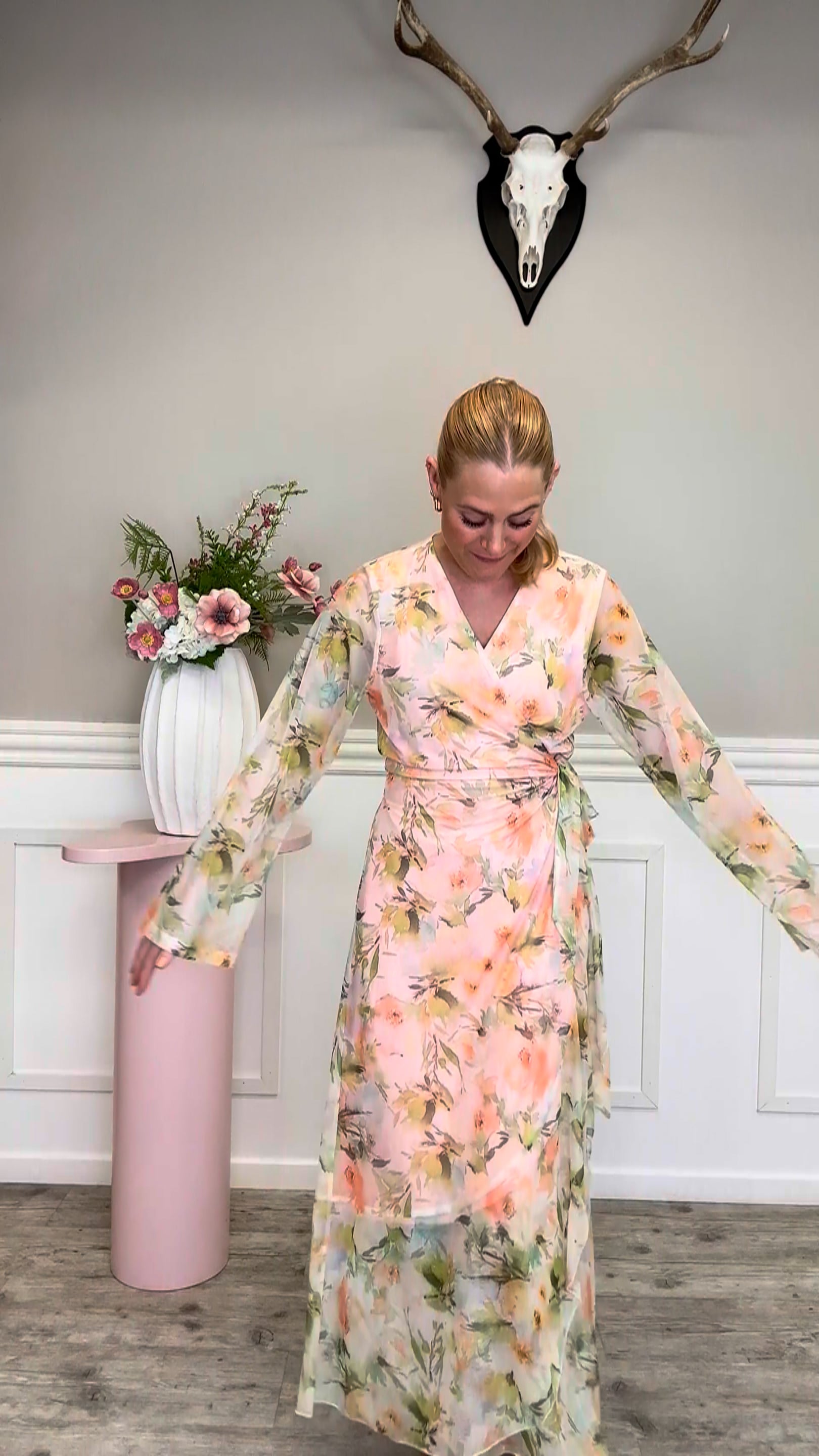 Smuk lang kjole fra Loved by Lykke Lovely. Endelig er vores Lovely Long Dress landet, og så i denne sommerlige farvekombination! Vi kan ikke få hænderne ned over denne kjole, som vi også har i en brun farve fra "Fall" kollektionen. I var vilde med den første, så vi håber at i er lige så glade for denne version. Kjolen har et taknemmeligt, klassisk snit som snørres ind i siden, da det er en slå-om kjole. Den er let gennemsigtig på ærmerne og foret på kroppen. Kjolen har et strækbart materiale, så de fleste vil føles sig komfortable i den.