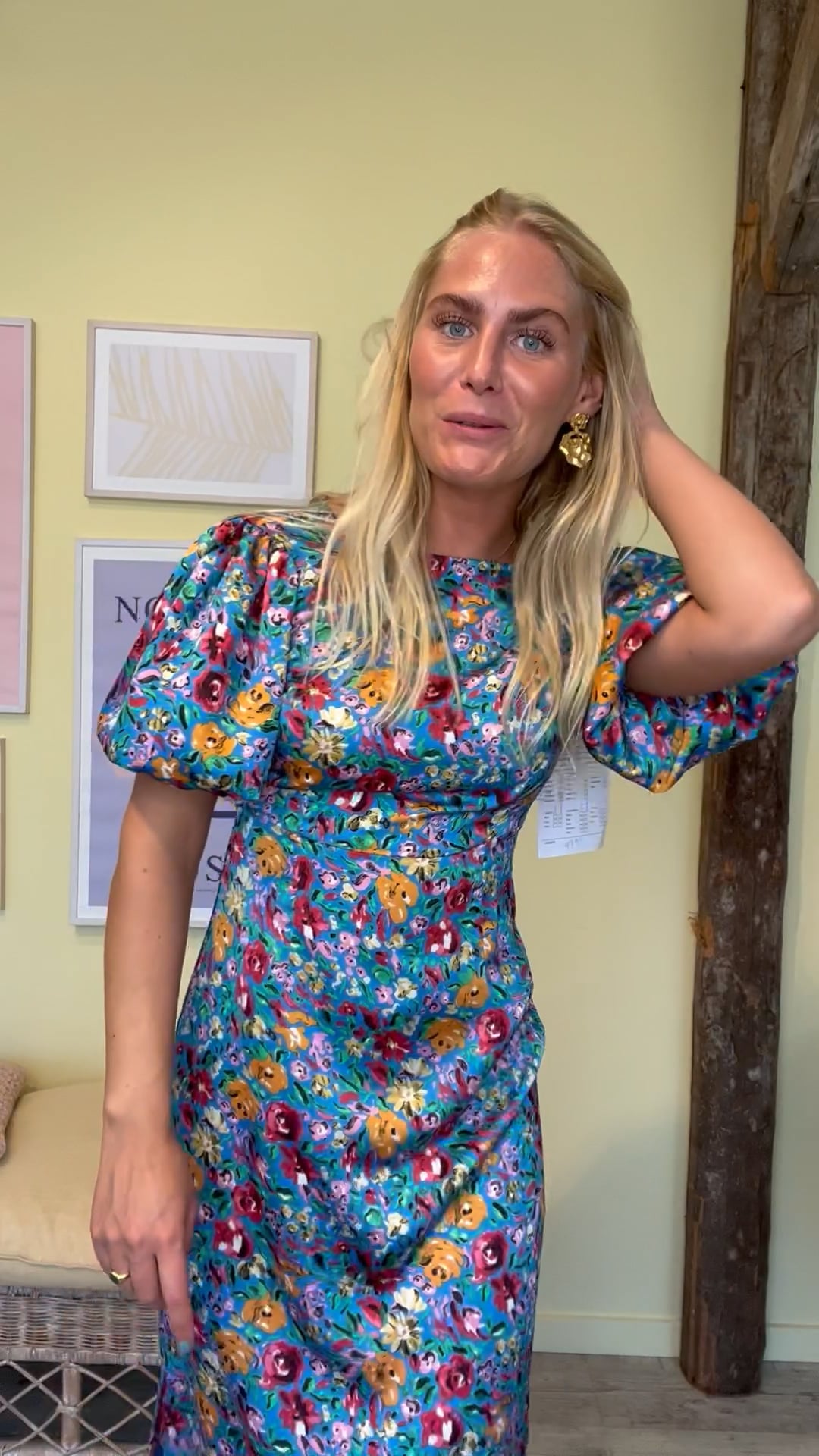 ENDELIG, kan vi vise vores nye Loved by Lykke design frem som lander til efteråret. Skal du have en rigtig WAAAAAU-effekt så skal du prøve denne kjole! Den er i den smukkeste blå farve med grafisk blomsterprint i flere skønne farver. Kjolen er en model i kender som vi ved er en FAVORIT hos jer og derfor - vent ikke for længe hvis du skal nå at have denne smukke sag hjem da vi ved at der bliver rift om den og er begrænset antal!