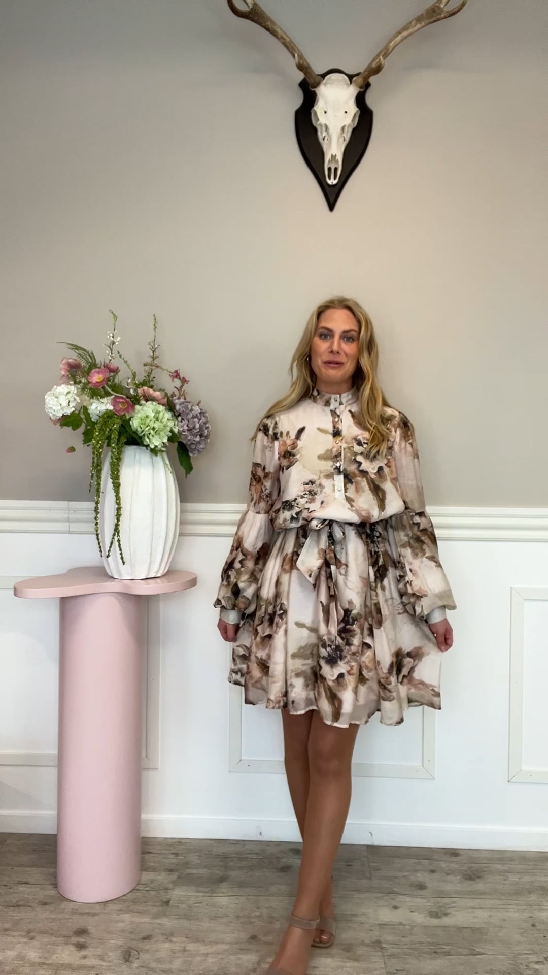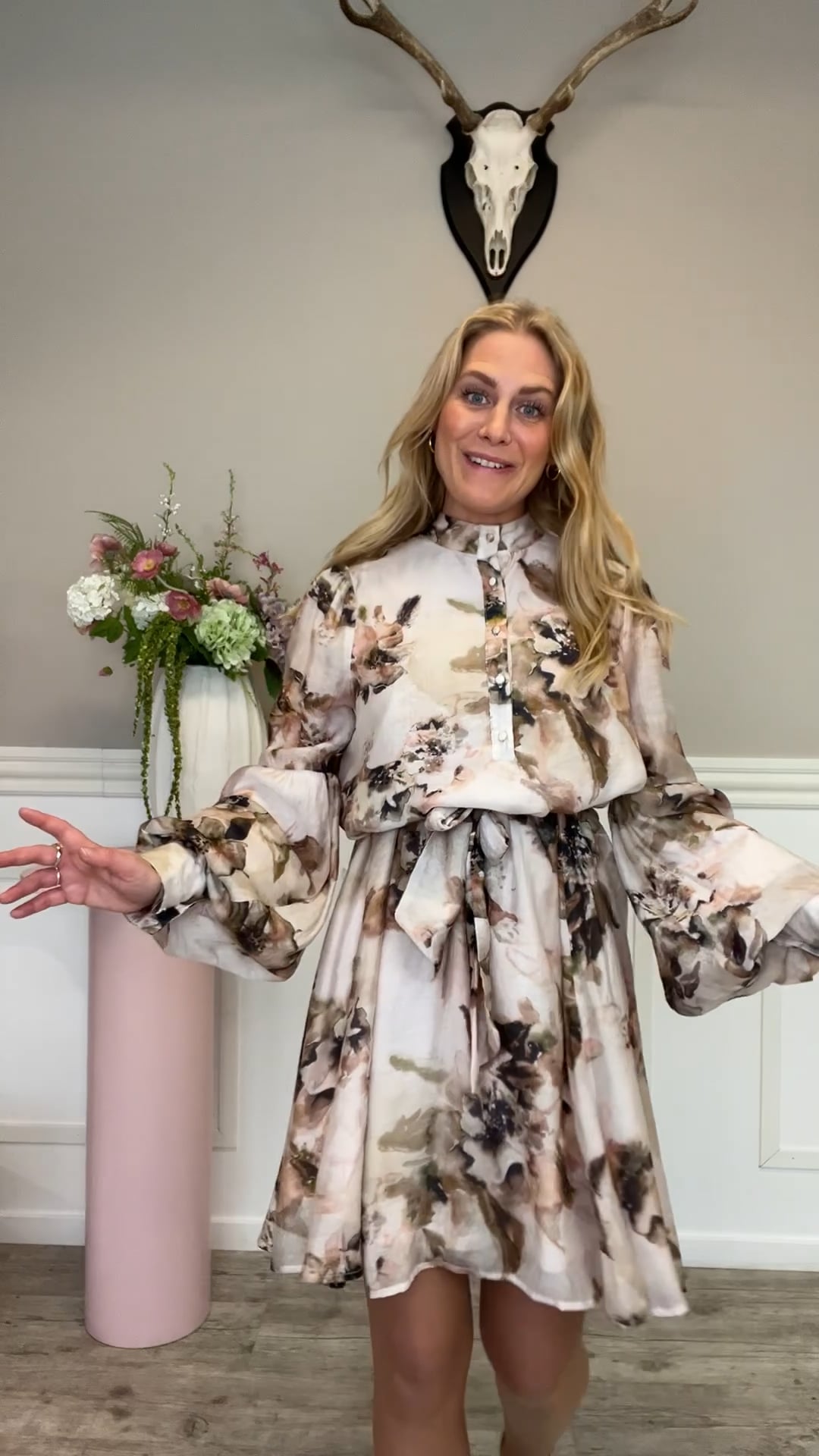 Kjolen fra Loved by Lykke er designet i en lys, pudderfarvet bund med et elegant blomsterprint i afdæmpede brune og rosa nuancer. Den har lange, let voluminøse ærmer, som giver et feminint og sofistikeret udtryk. Den høje hals med knaplukning tilfører et klassisk og stilrent look. Taljen fremhæves med et bindebælte, der skaber en flot og flatterende silhuet. Kjolen er ideel til både hverdag og særlige anledninger og kan styles med sandaler eller støvler.