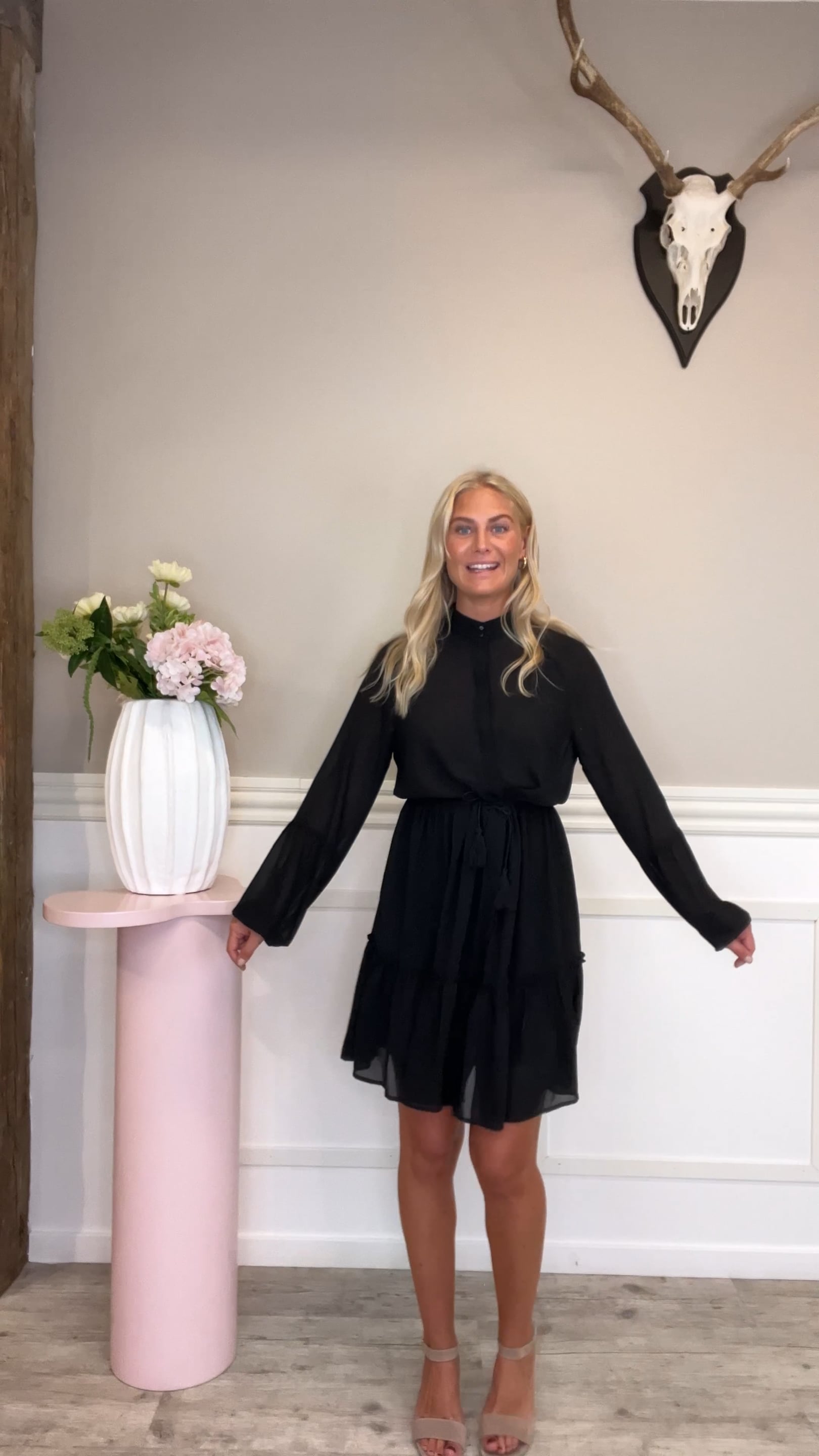En lille sort kjole med ekstra charme fra Loved by Lykke! Måske kan du genkende fittet? Kjolen er nemlig med samme pasform som vores populære Rainbow Dress fra dette forår. Swan Dress har en løs pasform, let gennemsigtigt stof og smukke flæsedetaljer, der giver et feminint og legende udtryk. Der er gennemgående knaplukning, som gør den ammevenlig og så har den en sødt snoet bindebånd i taljen med en lille frilldetalje i enderne. Den er perfekt til både hverdagsbrug og en aften ude – bare style den med støvler eller hæle alt efter humør.