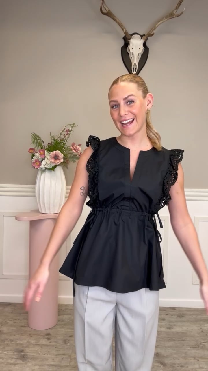 En virkelig sød top er landet fra vores eget brand Loved by Lykke til den kommende sæson! Denne top er i en klassisk sort farve, har broderede detaljer ved ærmerne og så har toppen snøre i livet i begge sider. Du får altså mulgihed for at snøre den ind efter ønske og dermed justere, hvor meget talje du ønsker i toppen her. Toppen har desuden to lag, så den bliver på ingen måde gennemsigtig.