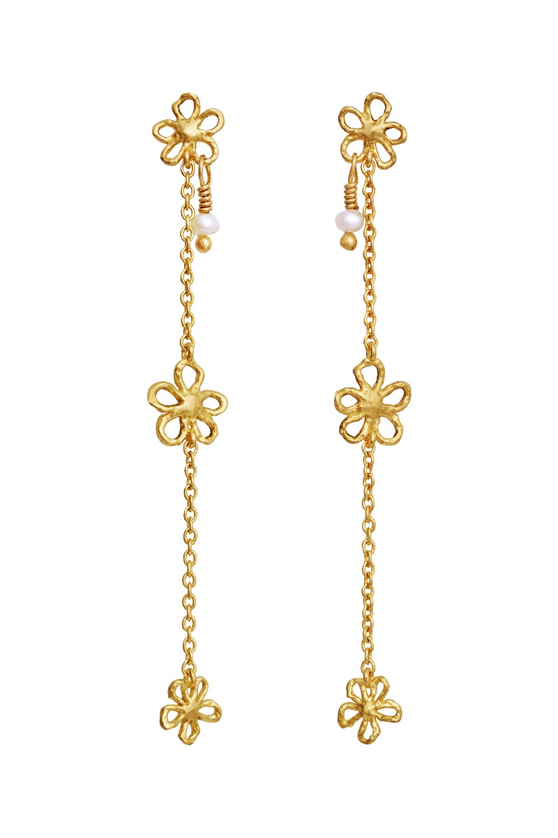 Et par smukker ørering i guld fra Maanesten. De har motiver med blomster. Derudover har de en fin perledetalje.