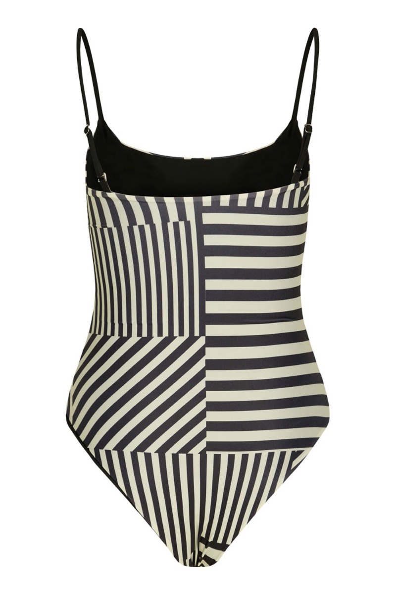 En cool badedragt fra Mads Nørgaard der er vendbar med helt klassisk sort på den ene side og de klassiske sorte og hvide Mads Nørgaard striber på den anden. Badedragten er designet i to lags stof for at få en utrolig blød og fast kvalitet der giver en god shape og støtte.