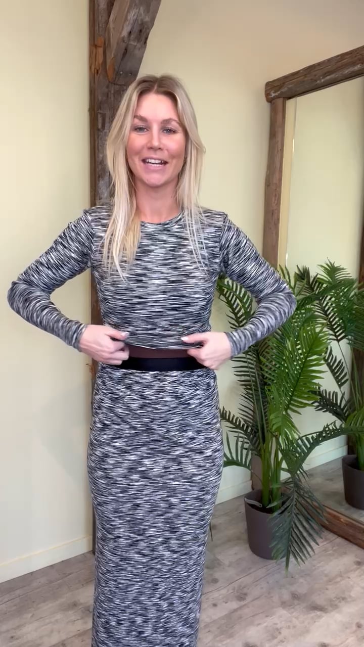 En sej bluse fra Mads Nørgaard er kommet i et fint meleret print i hvid og sort. Den er i en dejlig blød ribkvalitet, med masser af stræk i. Dette gør også at den ikke er perfekt til graviditetstøj. Der er nemlig også kommet en nederdel i samme kvalitet fra samme mærke. Sættet findes også i blå.