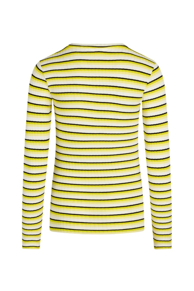 Den klassiske 5x5 tuba top fra Mads Nørgaard er landet i en ny skarp farve! Et stribet print i hvid, sort, gul og neon grøn, SÅ SEJ! Blusen er en klassisk langærmet trøje i en blød ribkvalitet. Den har et tætsiddende design med tætte ærmer og en rund halsudskæring. Den er med masser af stræk som gør den skøn at have på dagen lang.