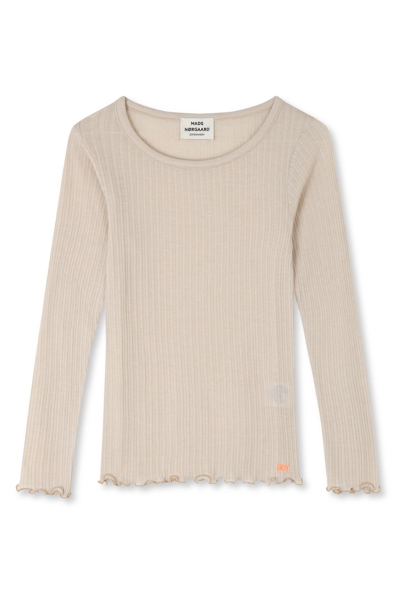 Den fineste bluse fra Mads Nørgaard i en beige nuance. Blusen har et fint ribbede mønster og er i den blødeste kvalitet. Der er små flæsedetaljer i bunden af blusen og i ærmerne. Derudover er der et lille orange logo i bunden. Den findes også i en beige nuance og er normal i størrelsen.