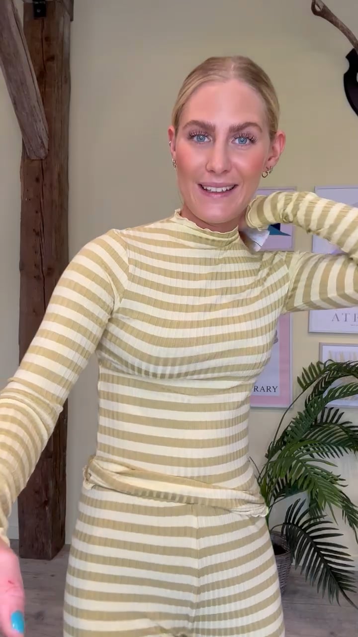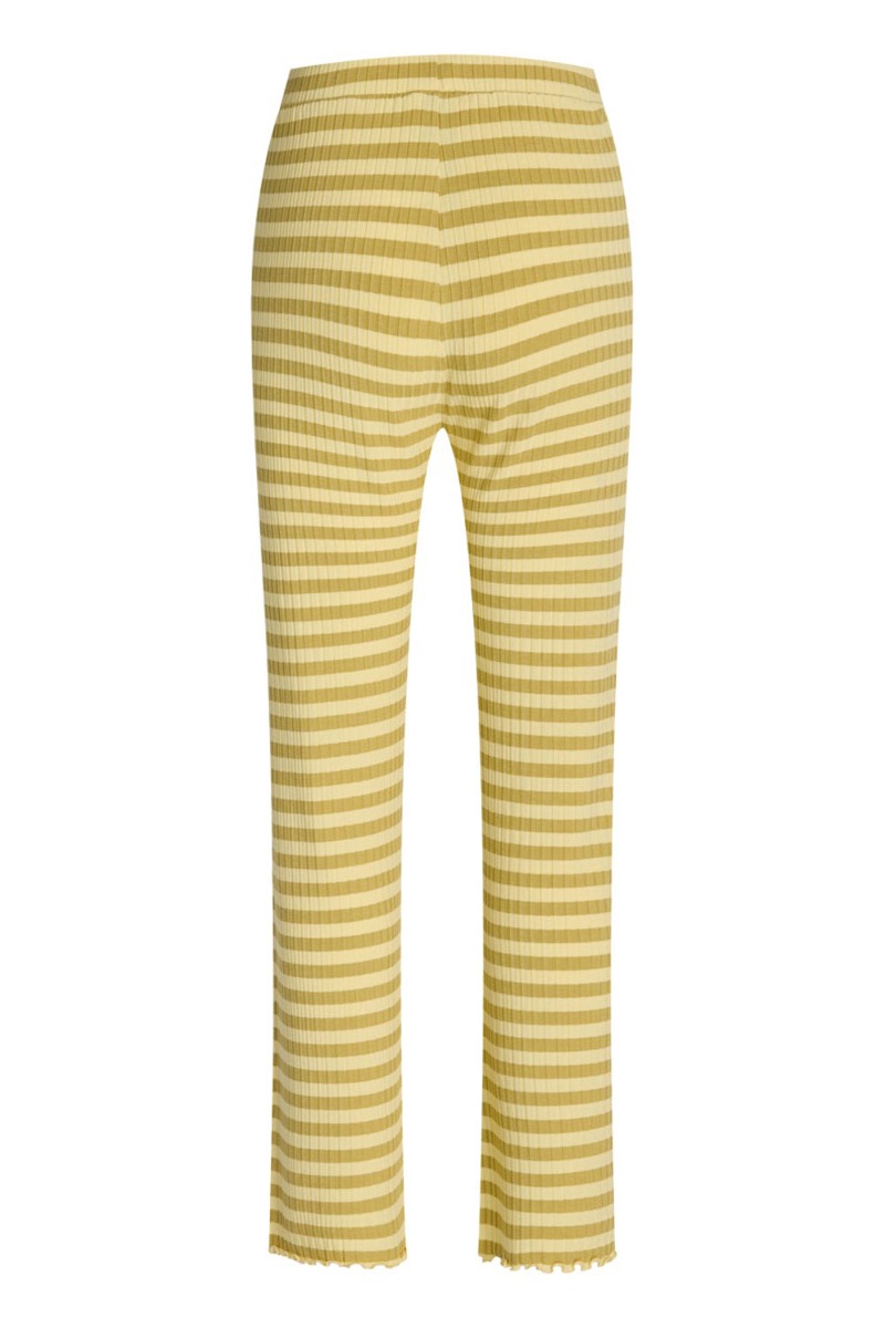 Bukserne er i den blødeste kvalitet i ribbet materiale med en lille krøllet kant i bunden og elastikkant i taljen. De er lige i benene med stretch og er super cool at bruge med den matchende bluse - både som hyggesæt men også til hverdag under en blazer.