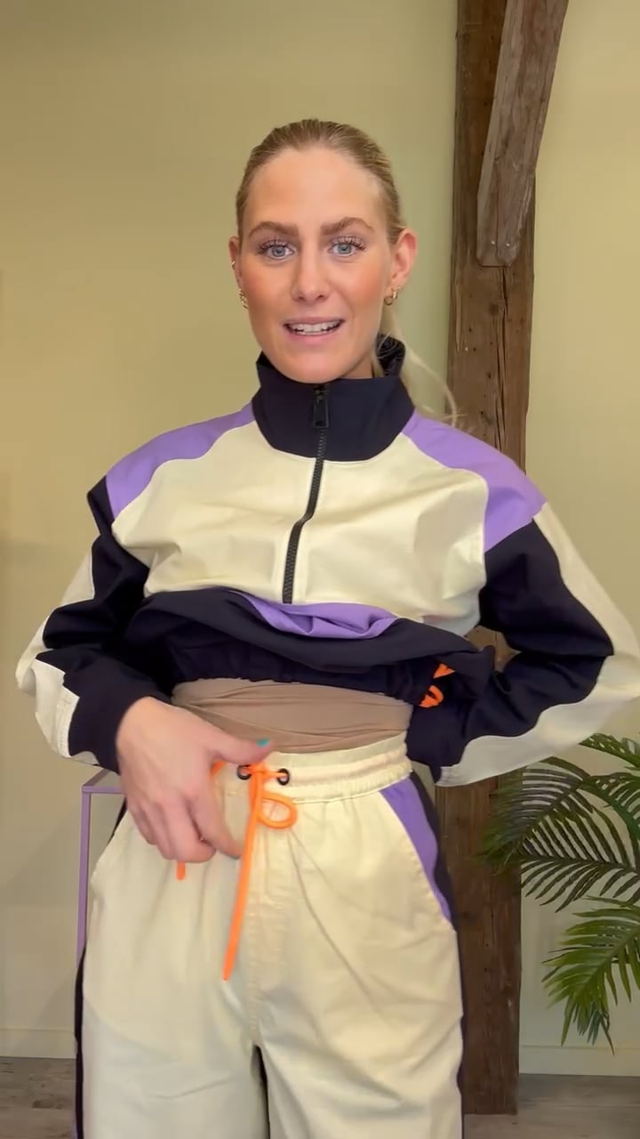 Bukserne er i et kraftiger materiale med en bred elastikkant i livet der kan snøres med neon orange snøre der går igen nede ved anklen. Bukserne er designet med lommedetaljer og et miks af lilla, cremefarvet og navy nuancer. Style dem som et cool sæt til hverdag og weekend.