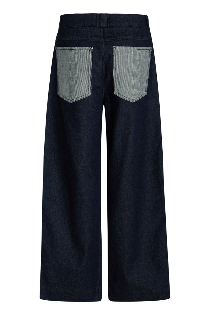 Sejeste denim bukser fra Mads Nørgaard i to-delt-farvet mønster med stribet detaljer. Disse jeans er lavet i en lækker denim kvalitet med lommer og i en bred pasform der er lige i benene. De er super cool at style med den matchende denimjakke.