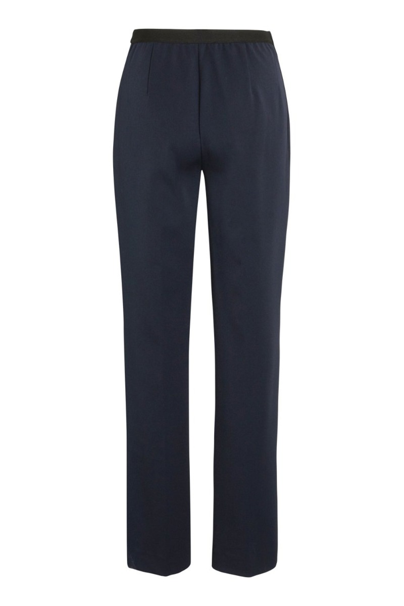 Mads Nørgaard bukser du altid kan hoppe i og som er lavet i et utrolig behageligt materiale med en smule stretch. De er navy med fast linning foran og elastik bagpå der lynes i siden. Bukserne har pressefolder foran og er en smule kraftig i stoffet med vidde i bunden. Disse bukser kan styles til alle anledninger efter vores mening.