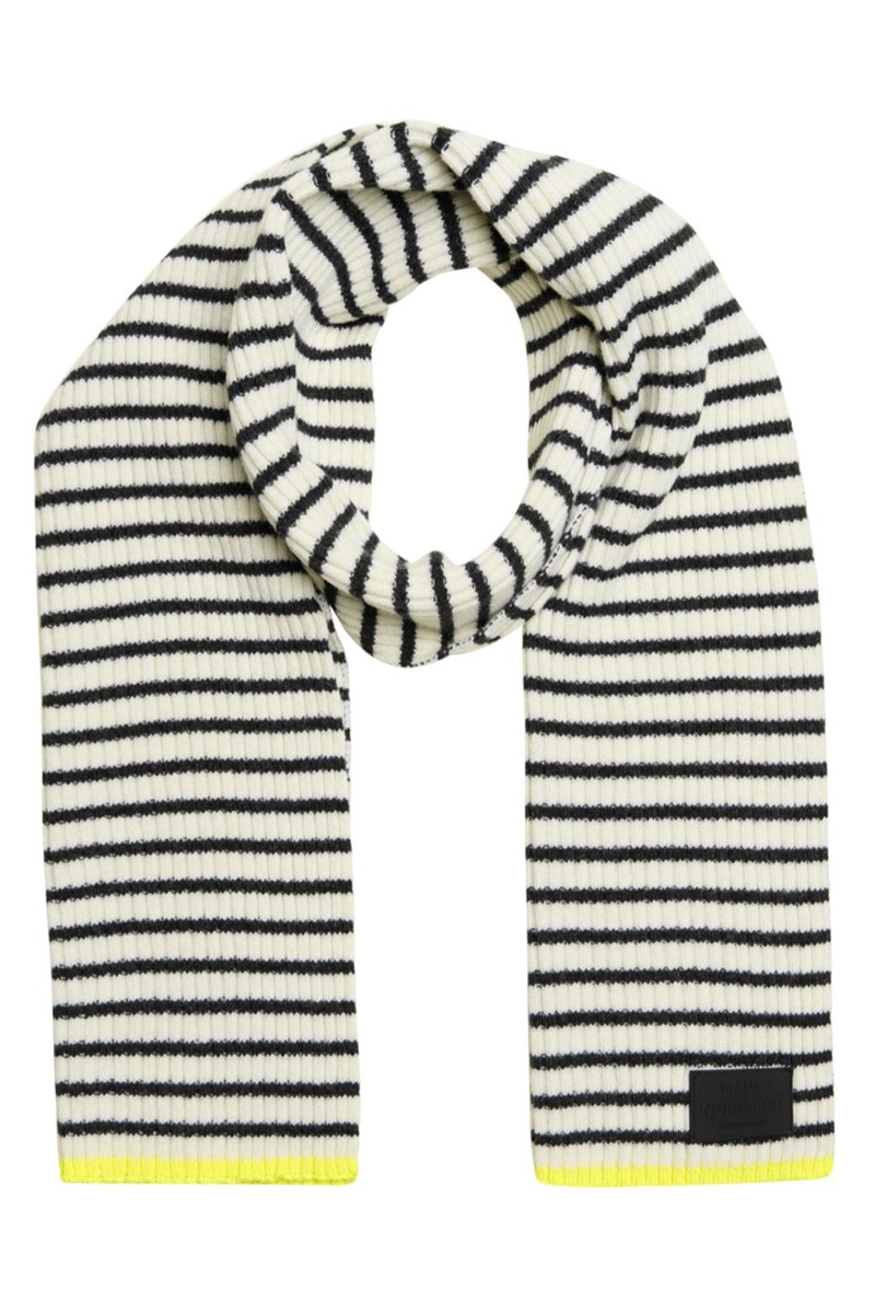 Det velkendte tørklæde fra Mads Nørgaard er med stribet mønster i mørke grå og hvid med neon gule detalje i enden. Det er lavet i en dejlig varm kvalitet der er behageligt at have på og holder dig varm.