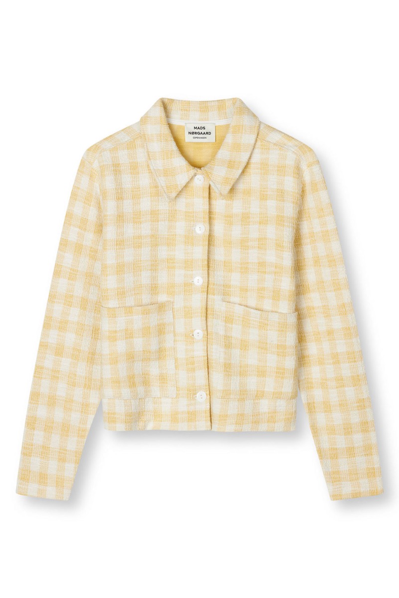 En smuk skjorte jakke fra Mads Nørgaard er kommet til denne sæson i en flot ternet mønster i gul og hvid. Den er i boucle kvalitet og her klassiske skjorte detaljer ved kraven og knappes foran med knapper i samme nuance. Den er rummelig og derfor god som overgangsjakke eller til en sommer aften.