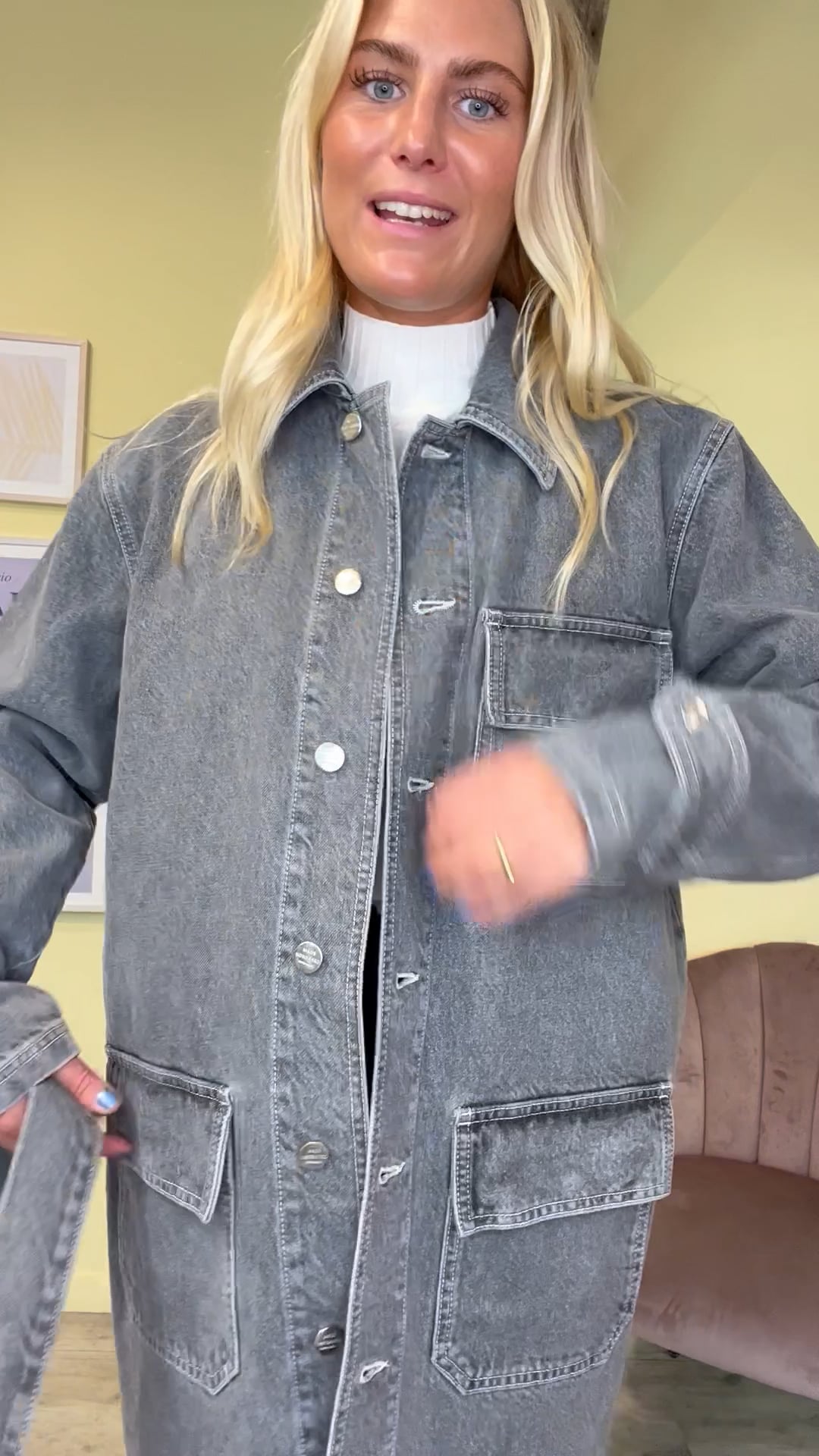 WAUV, se nu lige den sejeste denimjakke fra Mads Nørgaard med matchende bælte i livet. Jakken har længde i en oversize pasform med lommer og i en sej grå farve. Den er super cool at style både lukket som kjole eller over et par bukser med en top under.