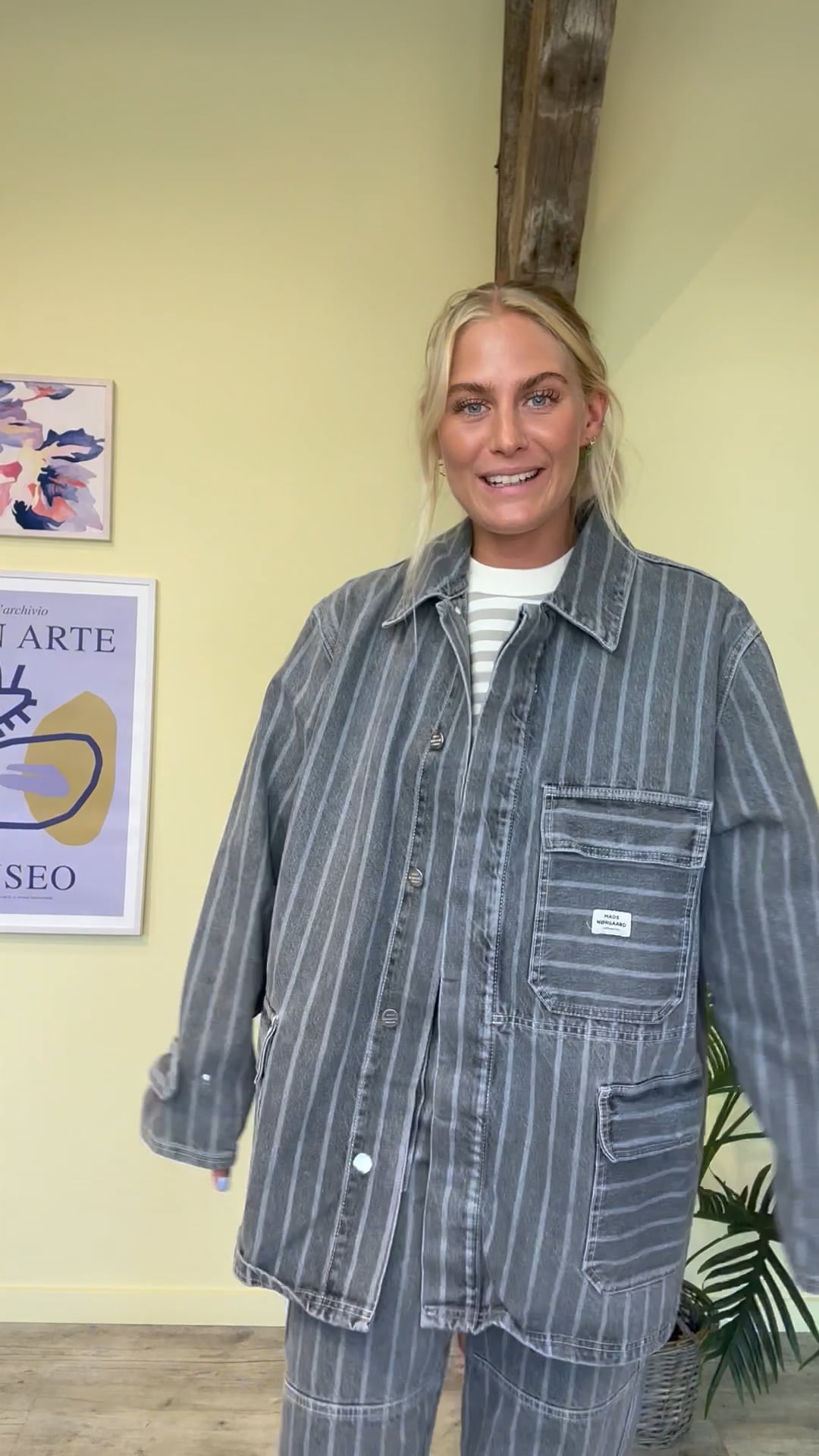 Cool jakke i denim med grå striber fra Mads Nørgaard i den velkendte Johnny model. Jakken er oversize med knapper foran og lommer. Den er i en flot lys grå og kan spændes ind ved de brede ærmer. Style den med de matchende bukser eller brug den som en let overgangsjakke til de lune dage med en strik.