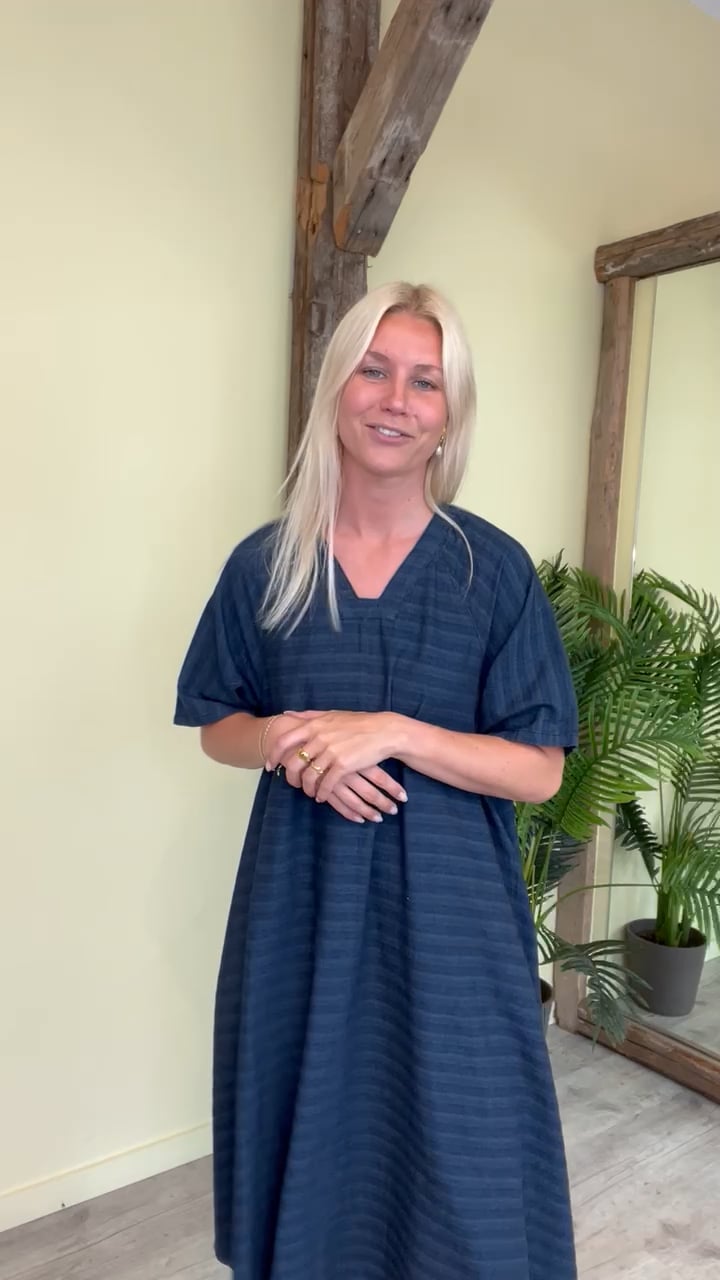 En sej kjole fra Mads Nørgaard er kommet i en smuk navy farve med en smule struktur i stoffet som danner et stribet mønster. Den er med A snit og derfor rummelig og løst siddende. Den er har V hals og har korte brede ærmer - en rigtig sommer kjole hvis du spørger os. Den er fin til hverdag med et par sandaler til.