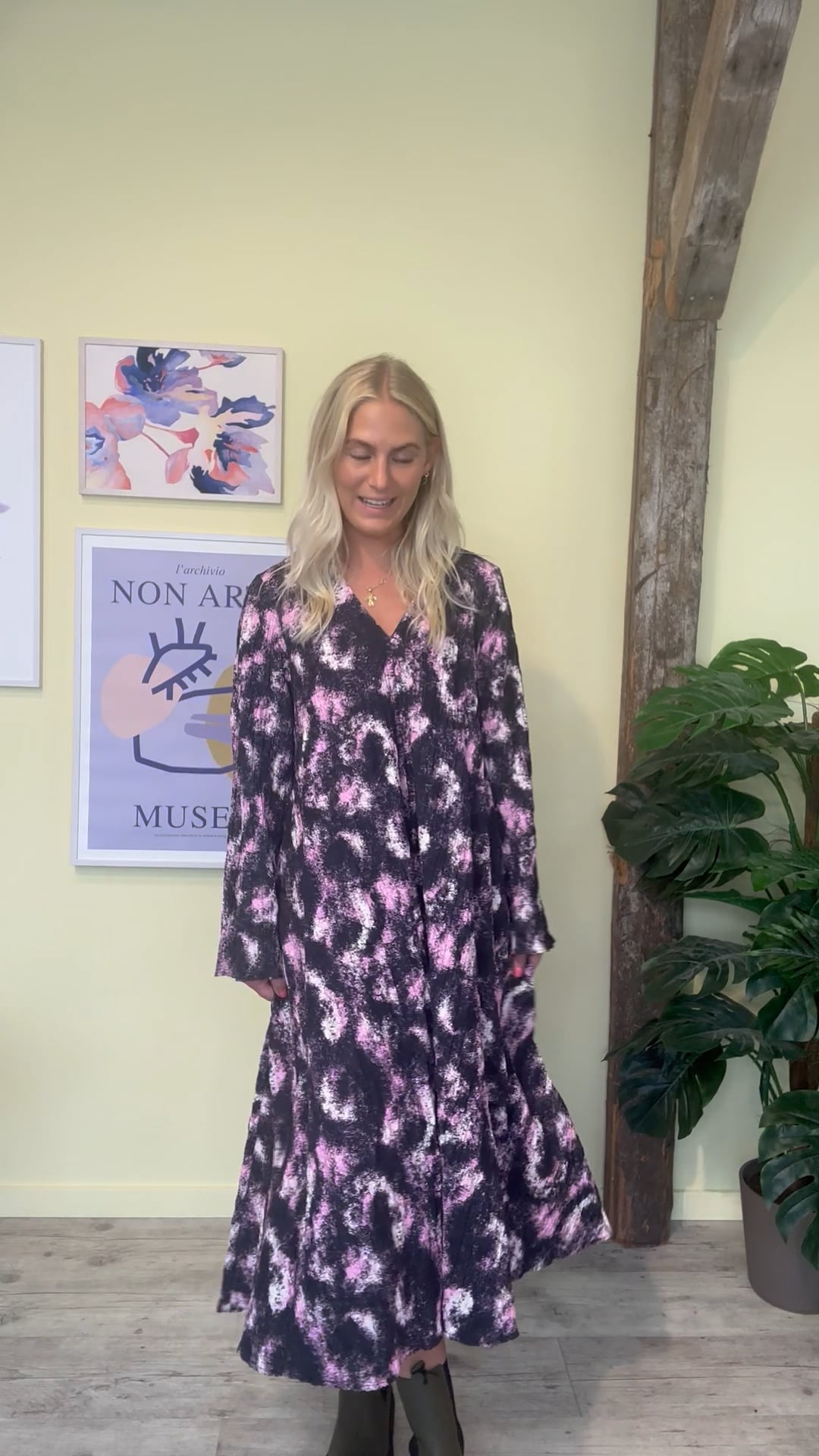 En rigtig Mads Mørgaard model med den brede A snit og V halsen samt de lange ærmer. Kjolen er lavet en en plisseret kvalitet som giver en fin struktur til den print den også er lavet i. Der er lommer i begge sider, som begge er skjult lige ved syningen. Brug den gerne både med sneakers og stiletter.