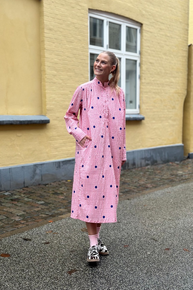 En virkelig sød og utrolig fin kjole er landet fra Mads Nørgaard i den fineste lyserøde farve med striber i en mørkere nuance samt mørkeblå prikker, som en super sej kontrast! Denne kjole er i den lækreste kvalitet, og er derfor også super behagelig at have på. Brug din både til hverdag og festlige anledninger!
