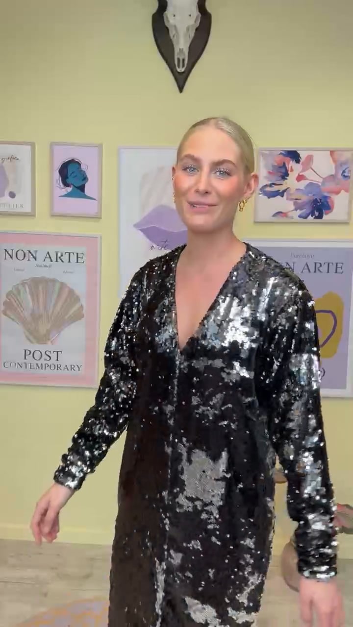 OH MY!! Denne Mads Nørgaard kjole er virkelig bare WAUW! Kjolen er i det flotteste skinnende paillet i sølv og sort der skaber et helt unikt mønster alt efter hvordan pailletterne vender. Kjolen har både et slankt og løs udtryk med lange ærmer og en v-udskæring foran. Style kjolen med en stilet eller gør den cool og miks med en rå støvle istedet.