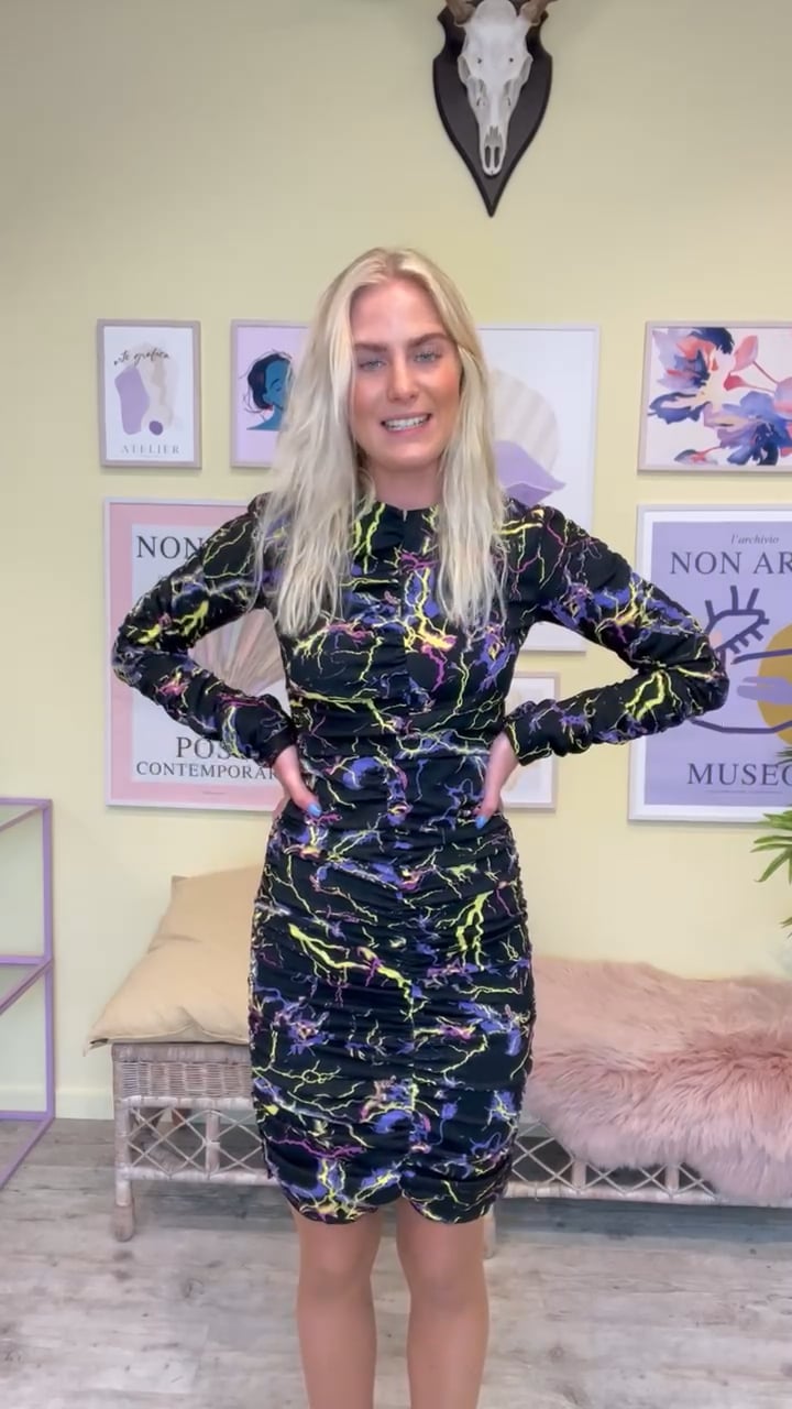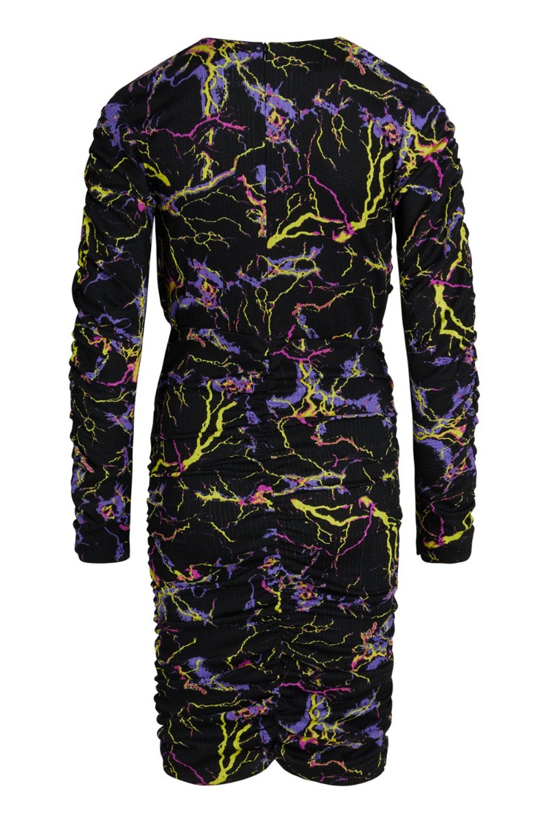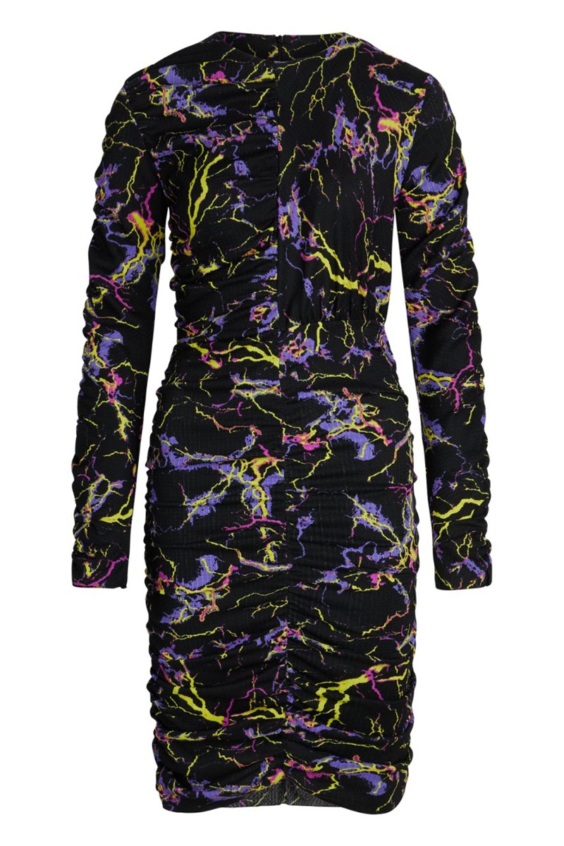 Kjolen er designet med rynkeeffekt foran og i siderne, hvilket gør kjolen ikke sætter sig ind på de forkerte steder. Bundfarven er sort med et sejt grafisk mønster. Den runde hals lukkes med lynlås på ryggen så den er nem at komme i og af. En kjole der er nem at style til alle slags anledninger.