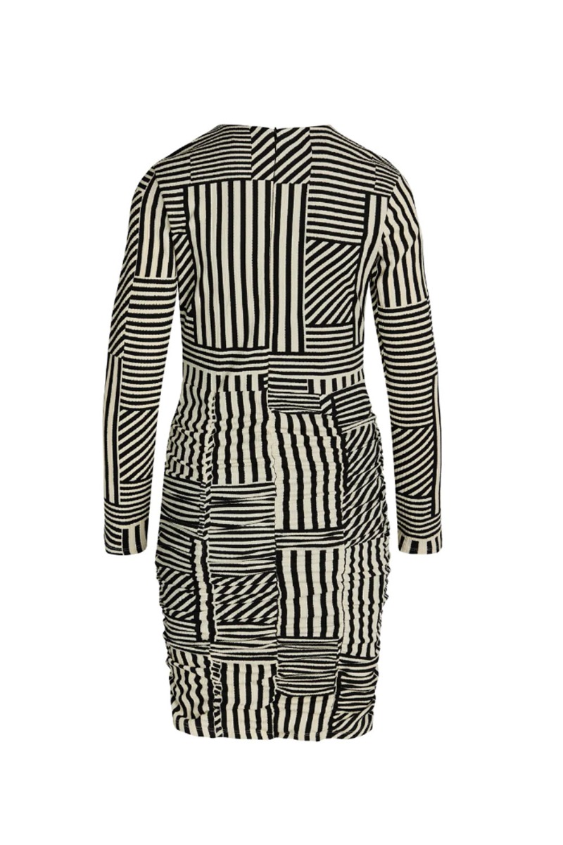 Kjolen er designet med rynkeeffekt foran og i siderne, hvilket gør kjolen ikke sætter sig ind på de forkerte steder. Bundfarven har et sort/hvid stribet mønster og egner sig derfor til alle anledninger. Den runde hals lukkes med lynlås på ryggen så den er nem at komme i og af. En kjole der er nem at style til alle slags anledninger.
