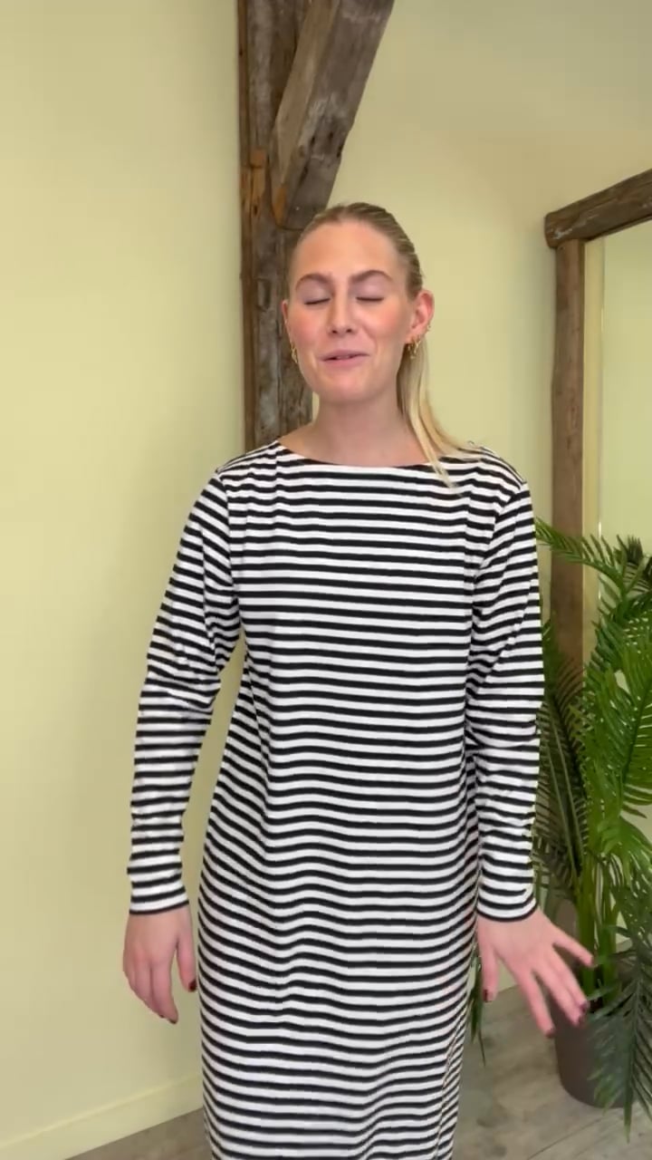 Den sejeste kjole er landet fra Mads Nørgaard til denne sæson. Den er løs i pasformen og lang i modellen. Den er dejlig blød i kvaliteten og med masser af stræk. Derfor kan den også bruges som graviditetskjole. Striberne er i sort og hvid hvor den også nemt kan styles til en cardigan eller en blazer. Den findes også i blå i en bluse model.