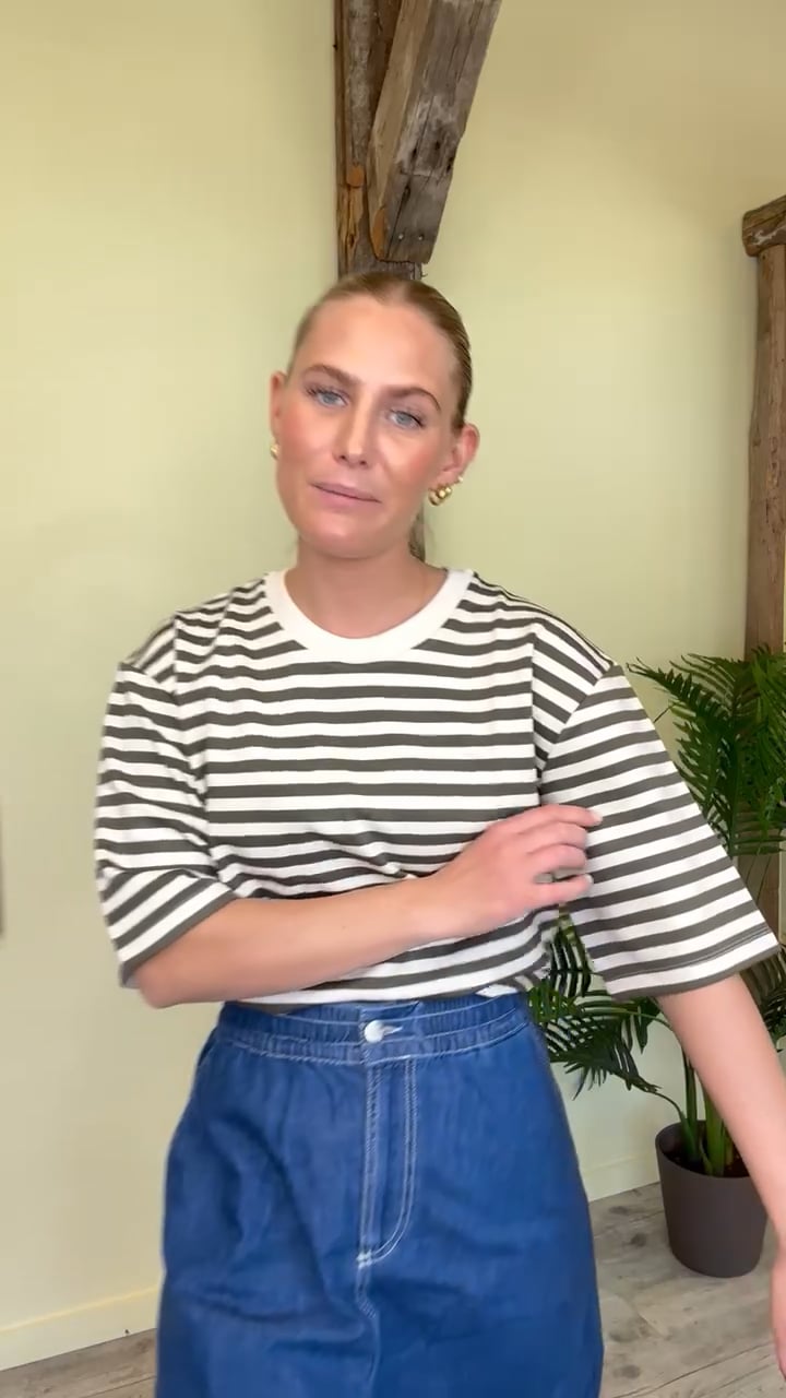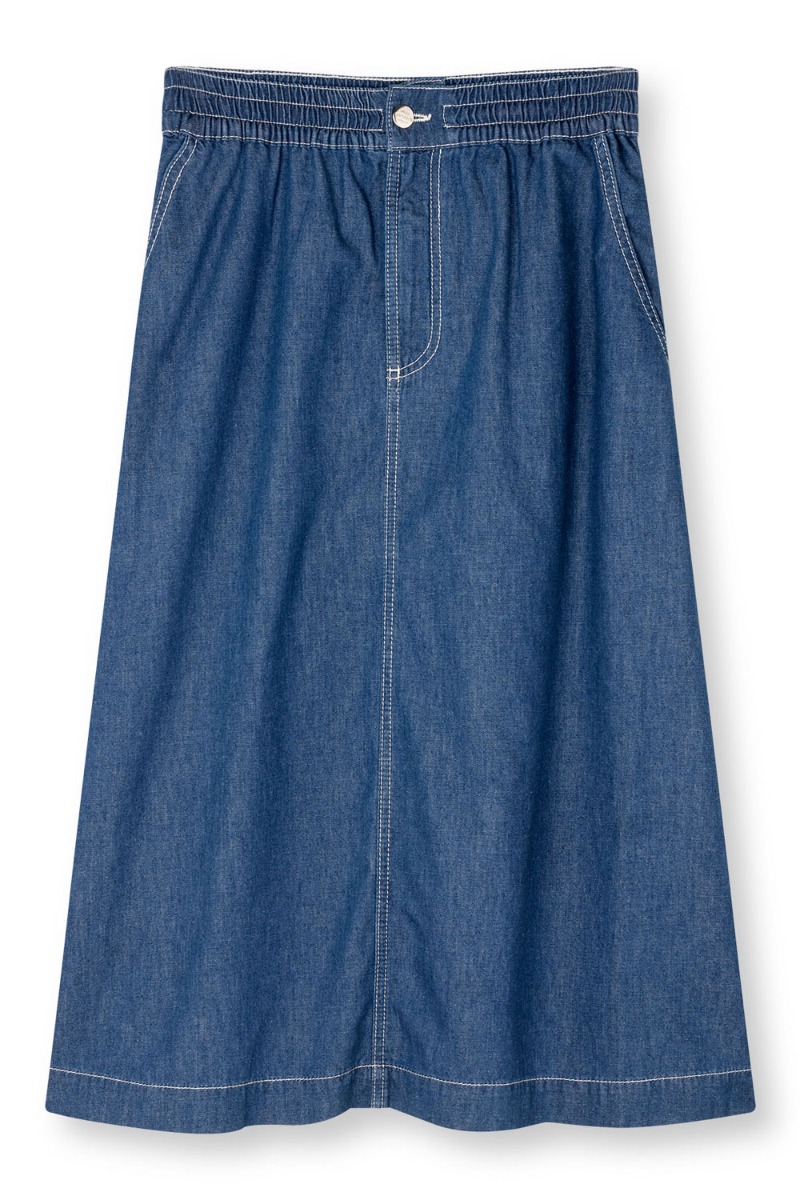 Fineste denim skirt fra Mads Nørgaard i en hel let blød denim kvalitet. Nederdelen har et løst a-snit der falder flot med en bred elastikkant i taljen der knappes foran. Style den til den matchende jakke eller med en enkel tee til hverdagen.