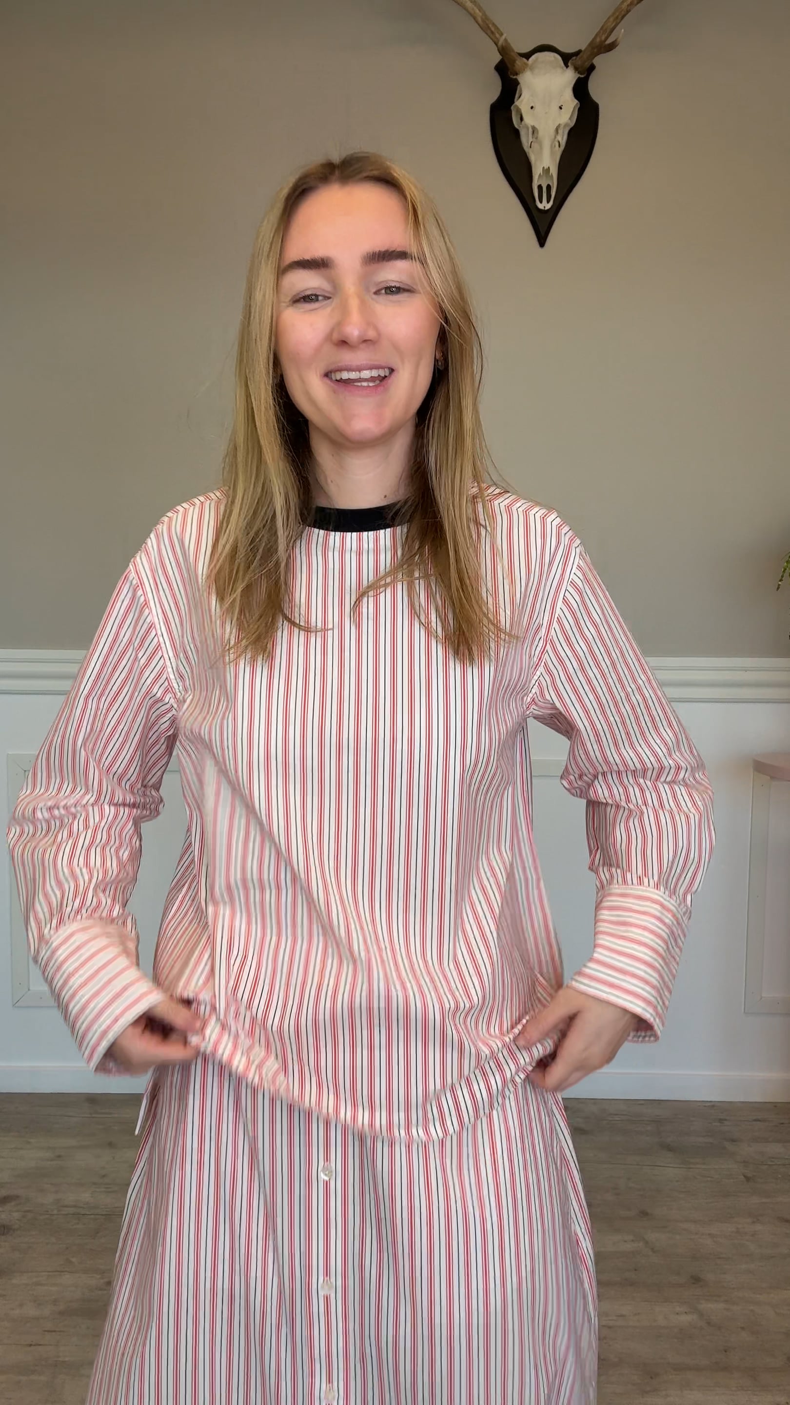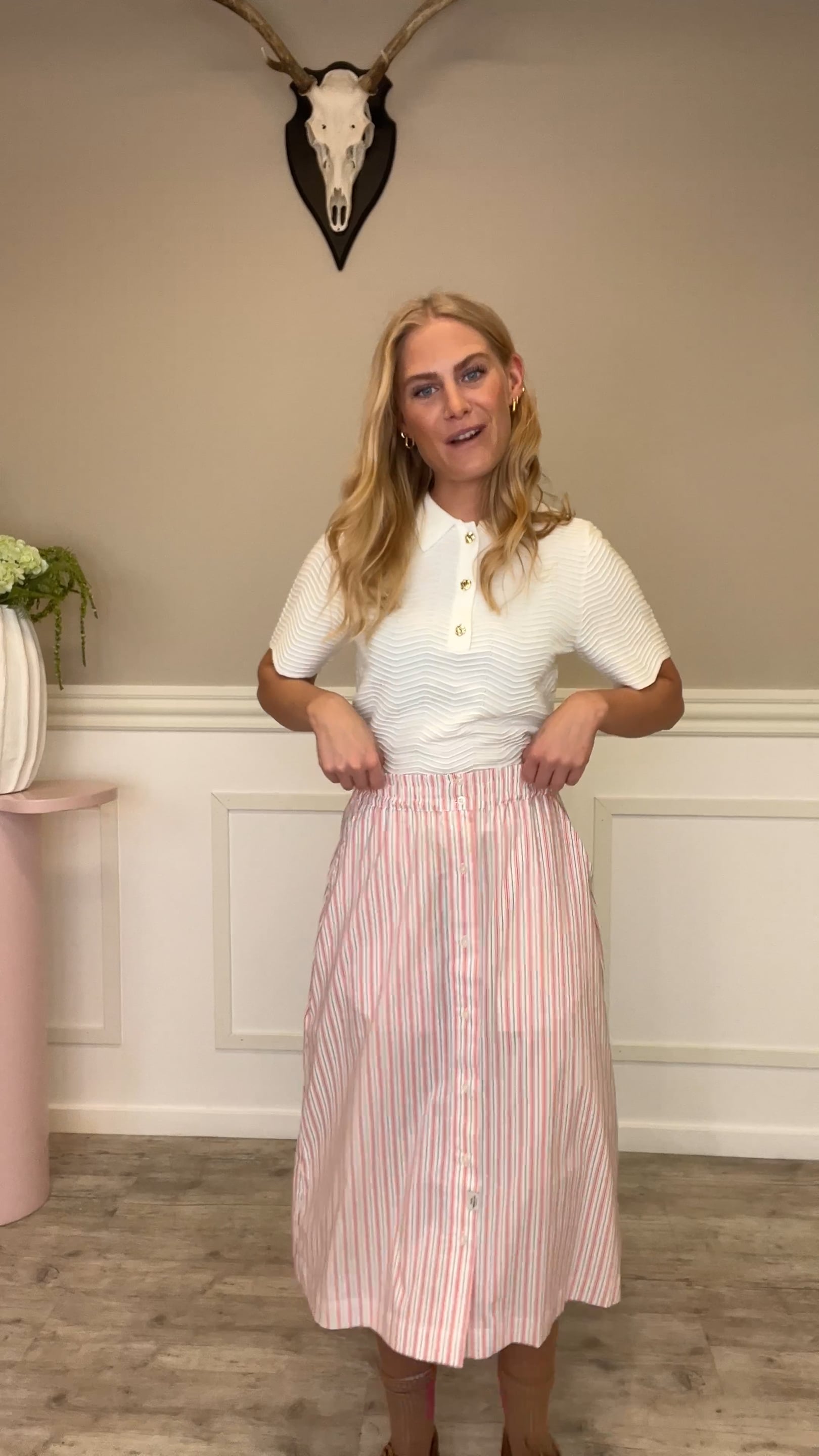 En super sød nederdel er landet her fra Mads Nørgaard. Denne nederdel er i den sødeste rødstribede farve og så har den fine knapper på midten. Nederdelen er dejlig luftig og har elastik i taljen, så den er bare super behagelig at have på!