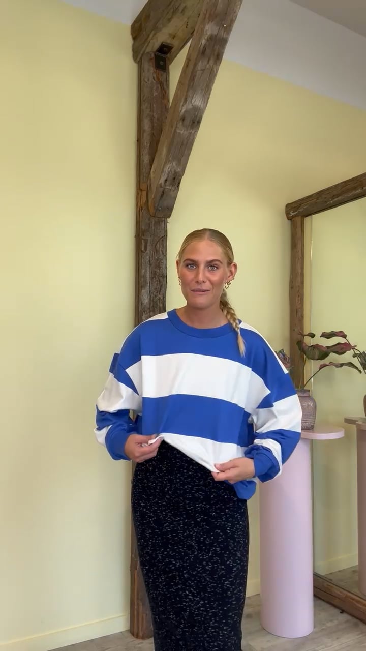 Den sejeste sweatshirt fra Mads Nørgaard i hvid og blå stribet. Den er oversize i pasformen og har rund hals. En perfekt hyggetrøje til de koldere sommeraftener!
