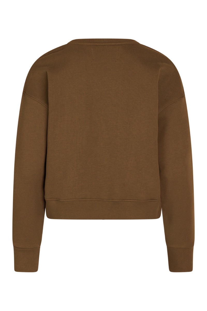 Dejlig sweat fra Mads Nørgaard i brun med rosa tekst foran. Sweaten er lavet i en blød kvalitet med o-neck, lange ærmer og ribkant i alle ender. Style den over dine kjoler eller til et par jeans.