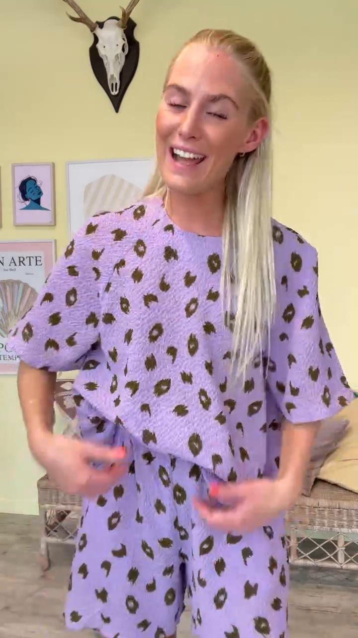 En fin t-shirt fra Mads Nørgaard i lyselilla med udtværet prikker i army grøn. T-shirten lukkes i nakken med en lille knap i samme farve. Men det smarte ved denne style er at den er i krølfrit materiale og alt den også findes i shorts. På den måde kan du få et helt sæt hvor du ikke skal tænke over om tøjet bliver krøllet ved brug. Og det kræver heller ikke strygning eller dampning inden brug.