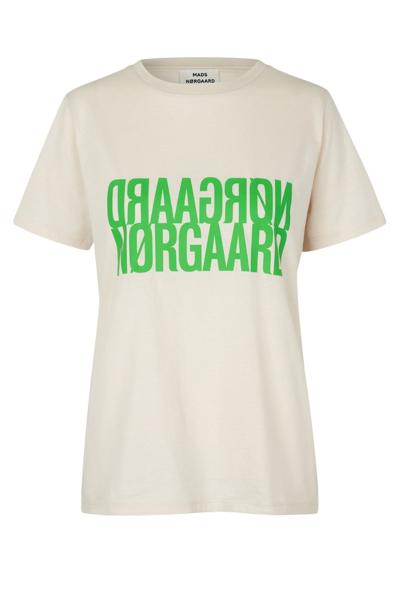Beige t-shirt fra Mads Nørgaard med grøn Mads Nørgaard logo foran. T-shirten er i den klassiske pasform der hverken sidder for løst eller stramt efter vores mening. Den har rund halsudskæring og korte ærmer. En t-shirt der bare altid er nem at style til hverdagen.