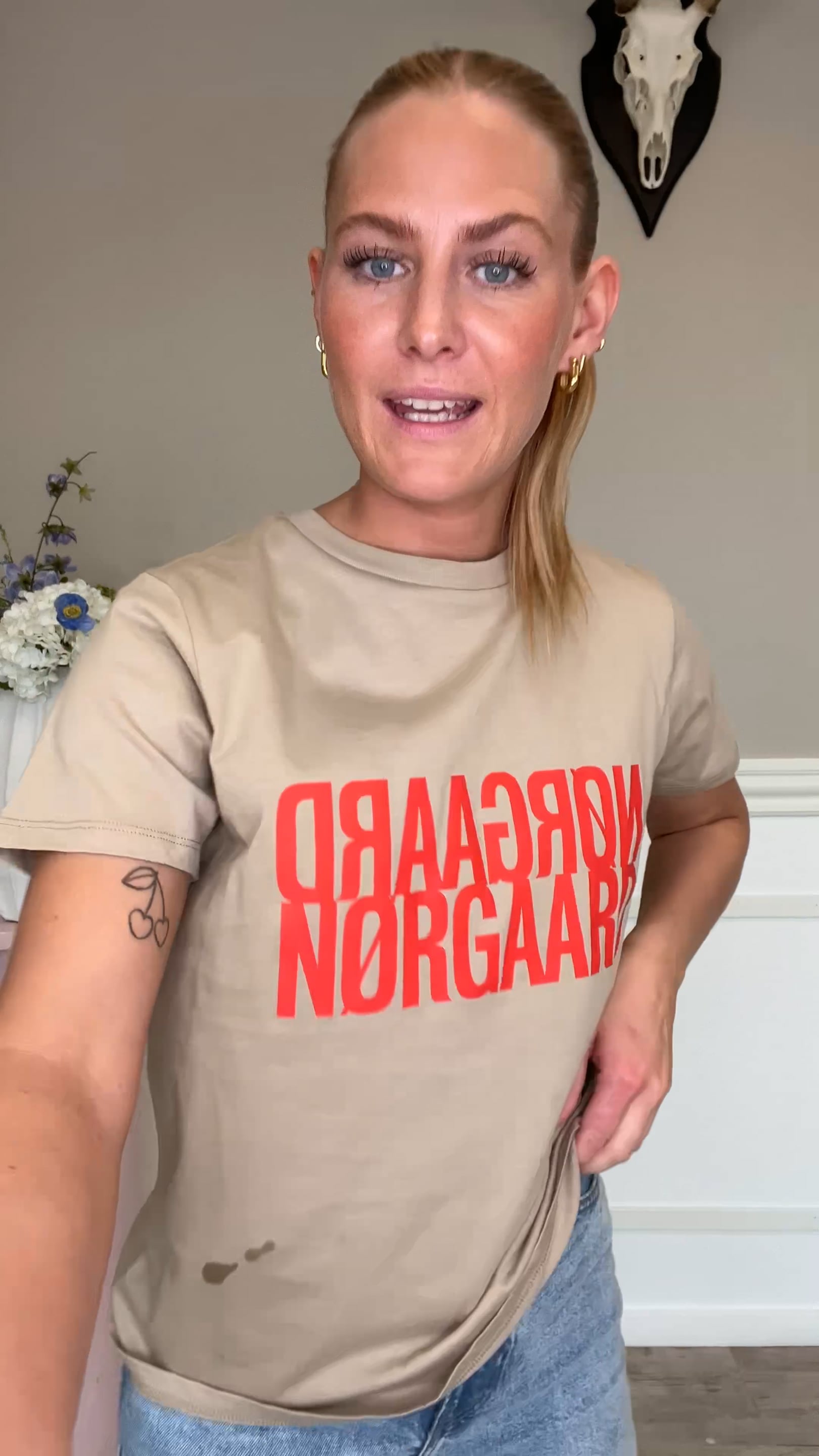 Brun t-shirt med orange Mads Nørgaard logo foran. T-shirten har et klassisk snit som vi kender den med rund halsudskæring og korte t-shirtærmer. Den er super nem at style til hverdagslooket med jeans eller en sød nederdel.