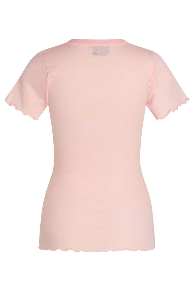 Fin t-shirt fra Mads Nørgaard i lyserød med et lille fint hullet mønster. T-shirten er tætsiddende med stretch i en dejlig blød kvalitet med rund hals og korte ærmer.