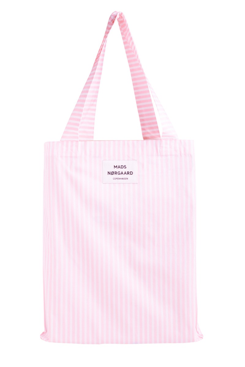Stribet net i hvid og lyserød fra Mads Nørgaard der er designet med logo foran. Nettet er perfekt til hverdagen og lavet i 100% økologisk bomuld. Det findes i flere skønne farver du finder ved at søge under "sacky atoma".