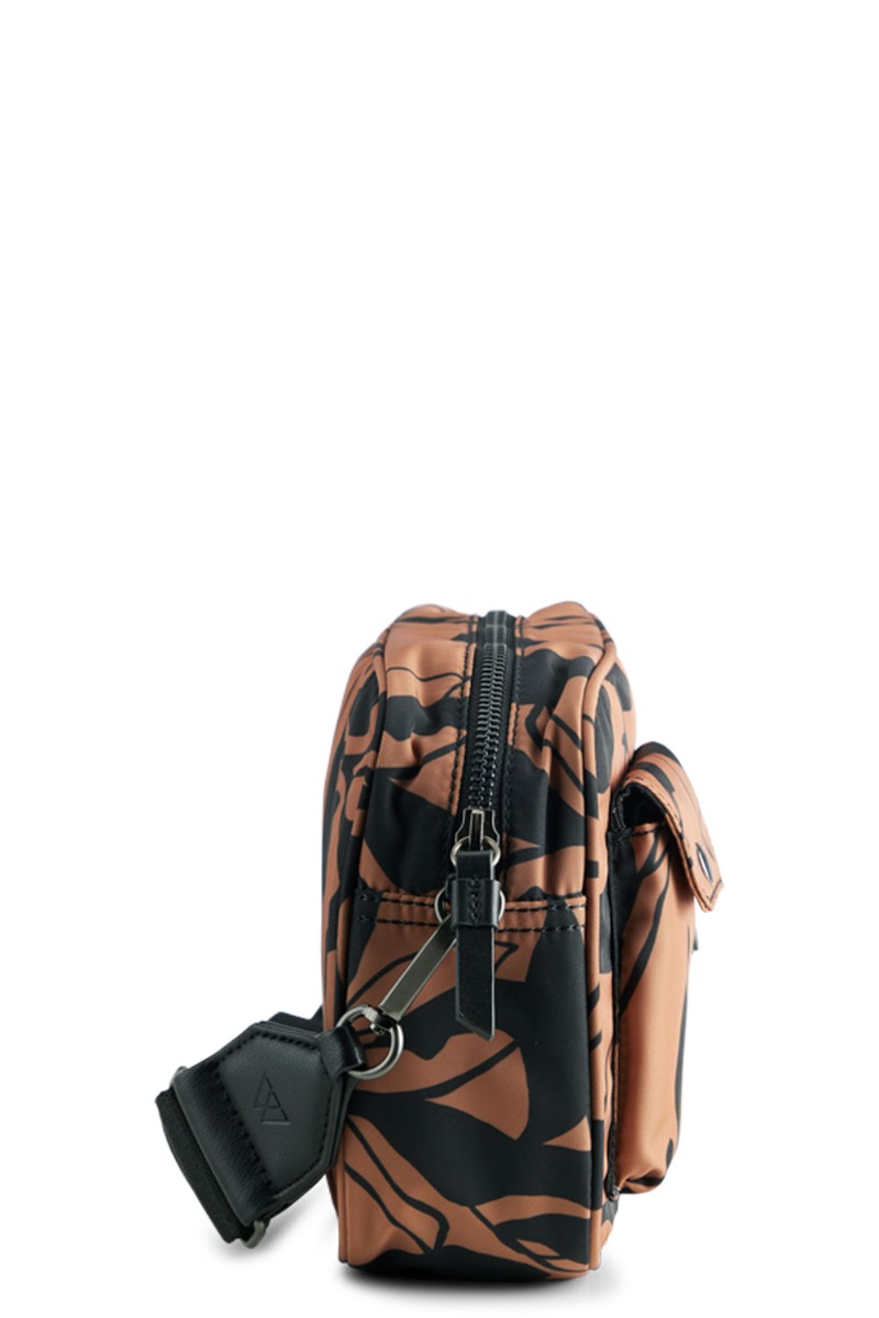 Den perfekte hverdagstaske fra Markberg med brun bundfarve og sort print. Tasken er lavet i et genanvendeligt materiale med et stort rum og små invendige. Tasken har to lommer foran og justerbar strop.