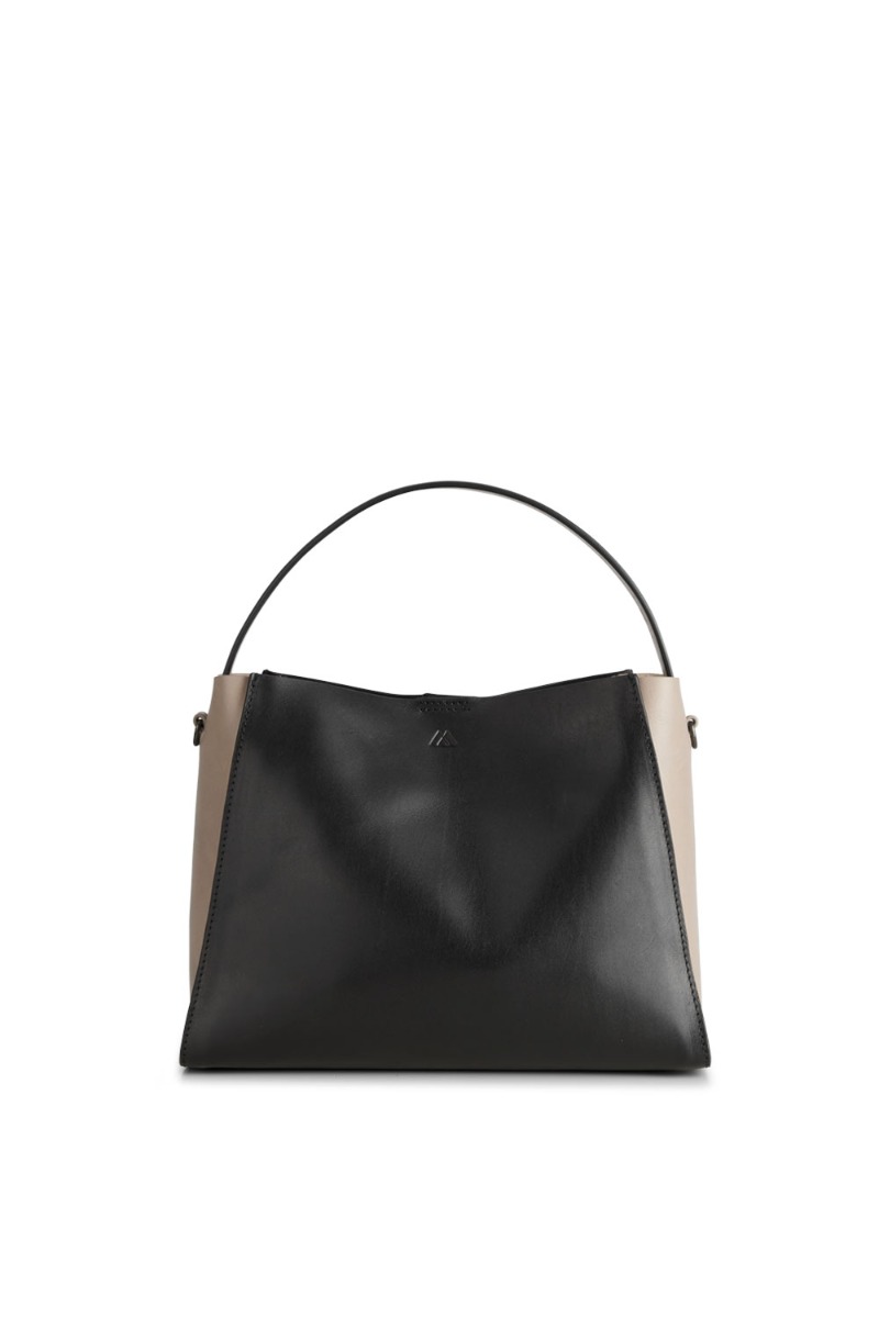 Den fineste taske fra Markberg er kommet i en dejlig blød kvalitet. Den er sort foran og bagpå samt med en smuk beige farve i siderne. Den har to stropper, så den både kan bruges som håndtaske og som skuldetaske. Den lukkes på midten med en magnet knap. Den kan bruges til alle outfits og er der god til alle anledninger.