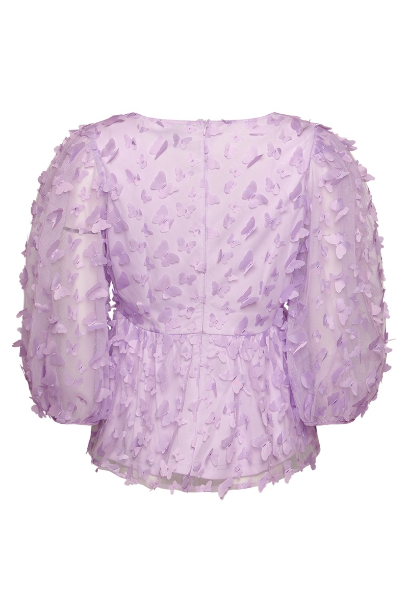 Denne Noella bluse bliver helt sikkert en af favoritterne til forårsfesterne! Blusen er designet med små påsyet somemrfugle der giver en smuk 3D-effekt. Den har en firkantet udskæring og lynes på ryggen. Blusen er gennemsigtig og foret ved kroppen, som giver en elegant detalje.