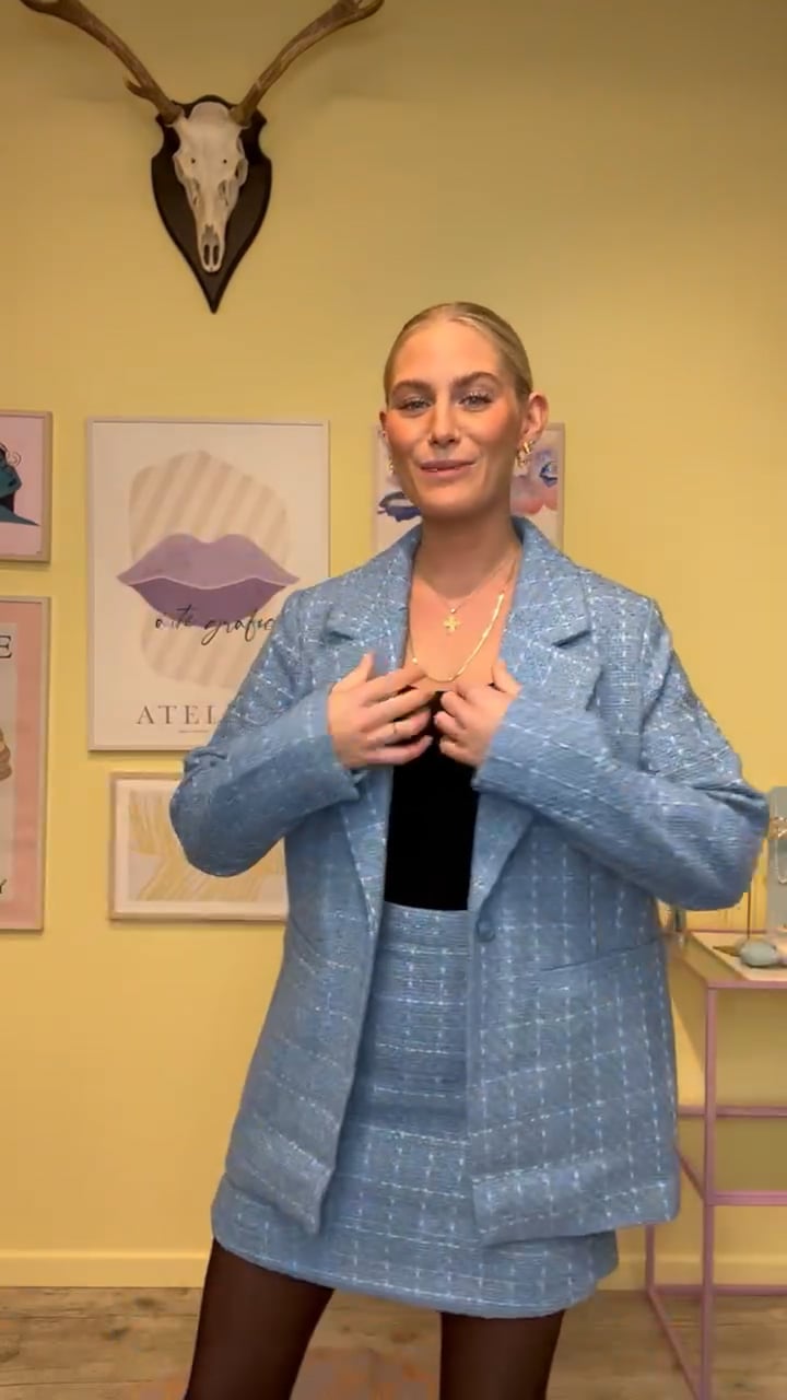 Den smukkeste blazer fra mbyM i blå bouclé materiale. Bouclé er dette kraftigt vævet stofkvalitet som giver et rigtig flot spil til dit outfit. Det er den perfekte pasformen blazer har - i hvert fald hvis du spørger os. Brug den gerne sammen med den matchende nederdel.