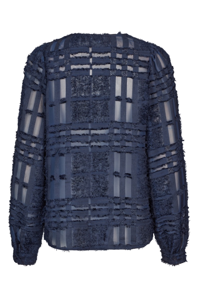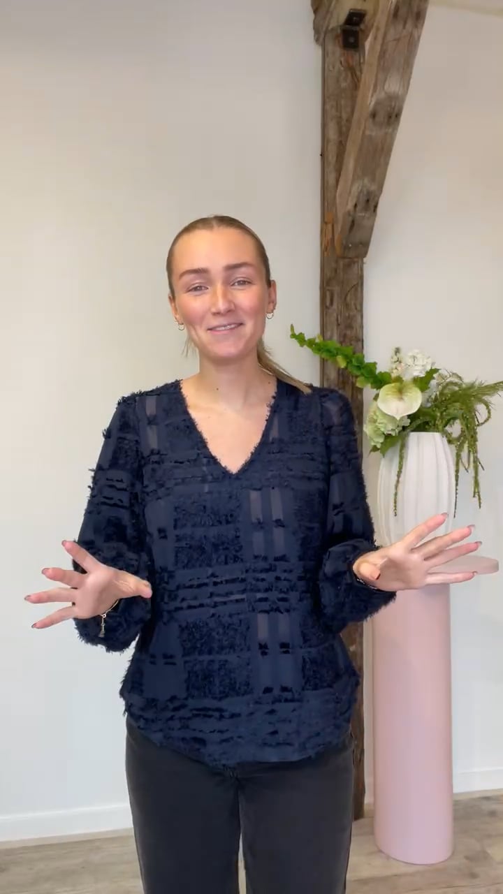 Super smuk og elegant bluse fra MbyM i en flot mørkeblå farve. Denne bluse er detaljeret i materialet, har pufærmer og en lille V-udskæring. Den er super fin til et par sorte bukser til fest, men kan også sagtens bruges til hverdag!