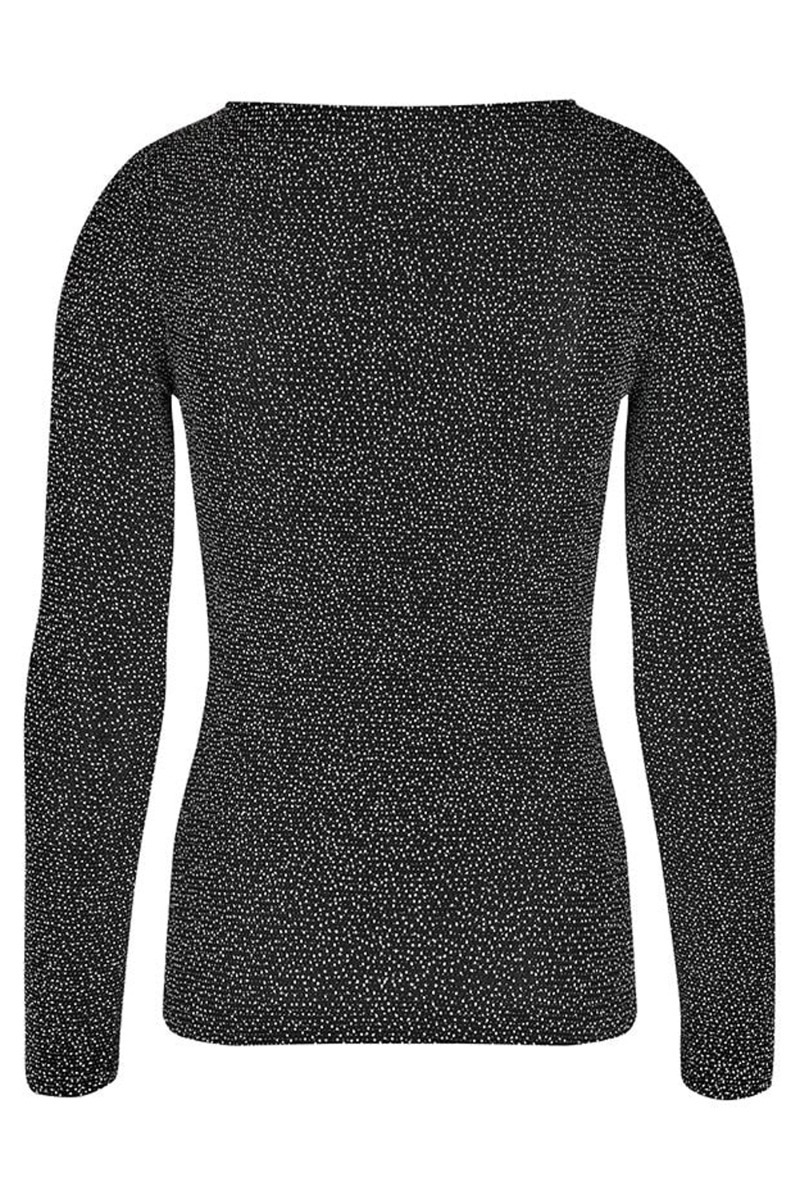 Sort bluse fra MbyM med små glimmerprikker der giver et festlig udtryk. Blusen er tætsiddende med rynkedetalje foran og masser af stræk der gør den behagelig at have på og sidder bare lige som den skal. Style den med en pæn buks til de kommende fester.