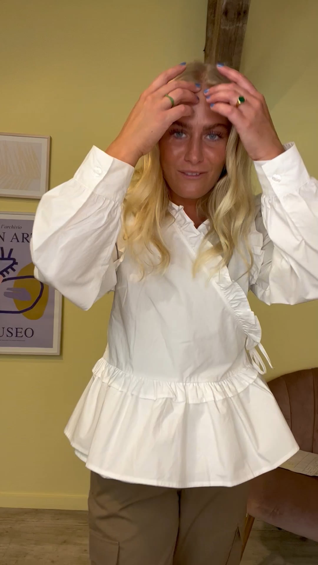 En smuk bluse fra mbyM i hvid er landet. Blusen er med slå-om effekt og har flæsedetaljer ved skulder, hals og bunden. Derudover lukkes ærmet med en enkelt knap og kvaliteten er kraftig. Den findes også i sort.