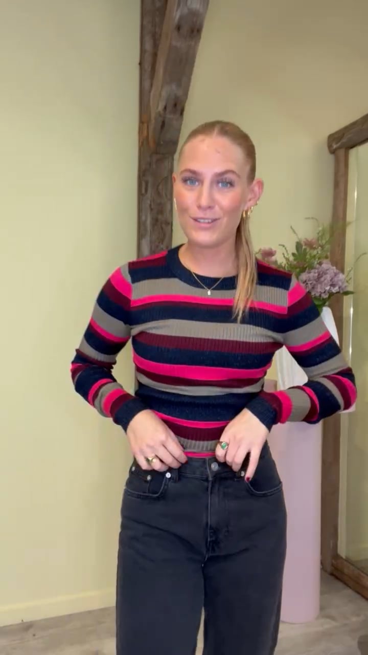 En sej stribet bluse fra mbyM i et stribet print med glimmer. Virkelig en lækker bluse i et tætsiddende snit med lange ærmer og rund halsudskæring. Den er designet i en blød ribkvalitet og FANTASTISK at have på. Styl den med et par cargobukser eller et par rå denimjeans.