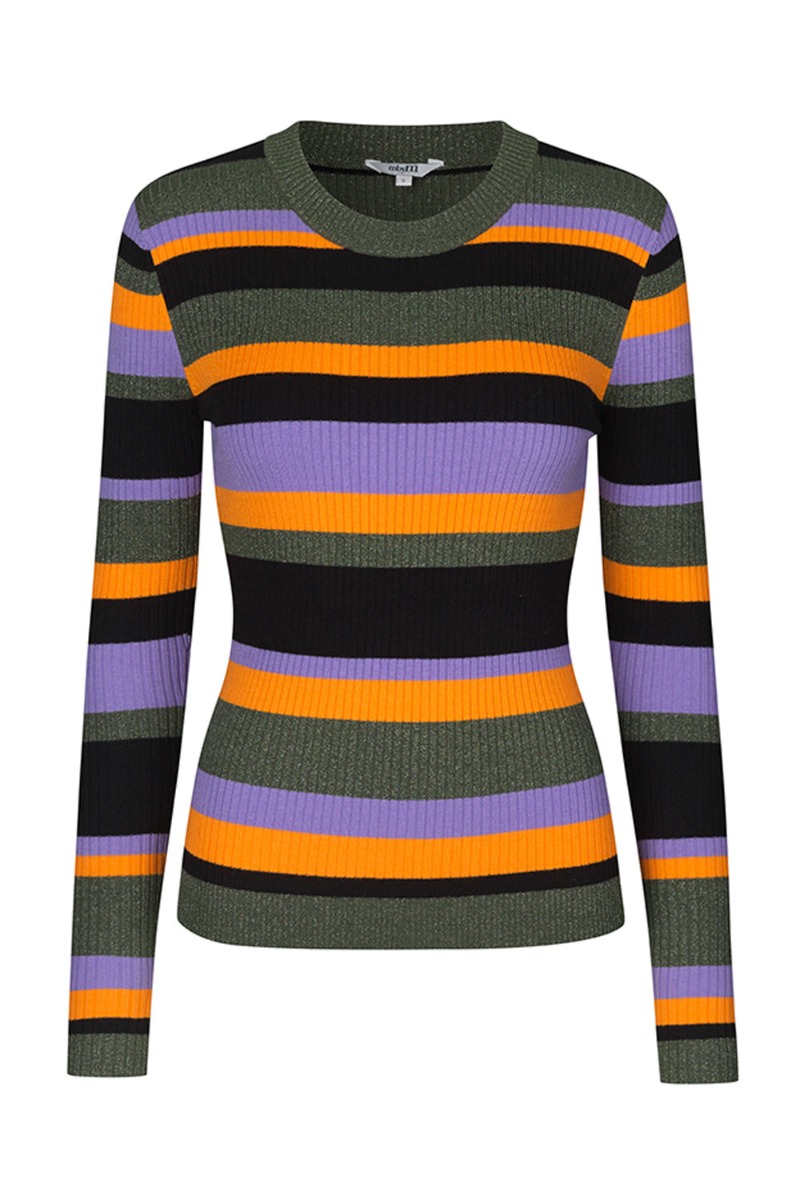 Smuk og sej stribet bluse fra mbyM i et stribet print af lilla, sort, orange og army glimmer. Virkelig en lækker bluse i et tætsiddende snit med lange ærmer og rund halsudskæring. Den er designet i en blød ribkvalitet og FANTASTISK at have på. Styl den med et par cargobukser eller et par rå denimjeans.