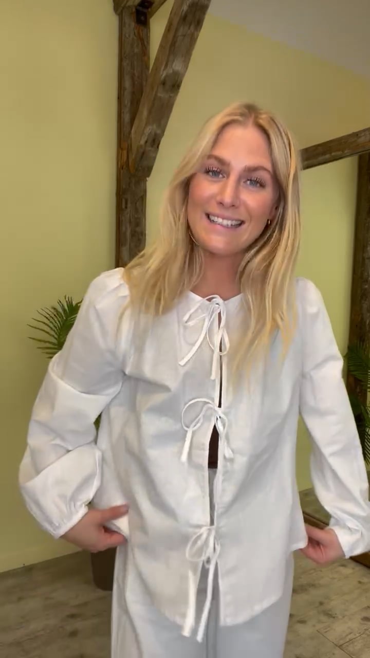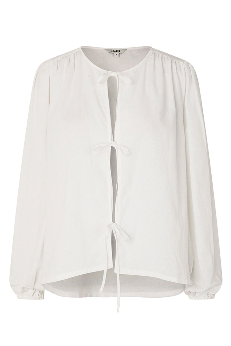 En sød bluse i hvid fra mbym med matchende bukser. Blusen snøres foran og giver små åbninger. Den er i et let materiale med lange ærmer og elastikkant i enden. Style den som sæt eller brug den til shorts og nederdele til de varme dage.