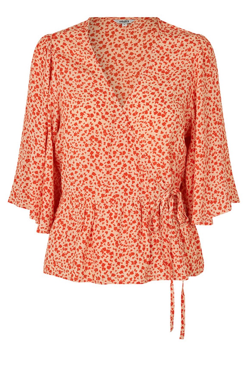 Super sød slå-om bluse fra mbyM i orangerødt blomsterprint. Blusen er i klassisk slå-om med bindebåndsdetalje i siden af blusen, fin v-udskæring og peplum. Den er designet med store volumiøse ærmer som giver en skøn livlig effekt.