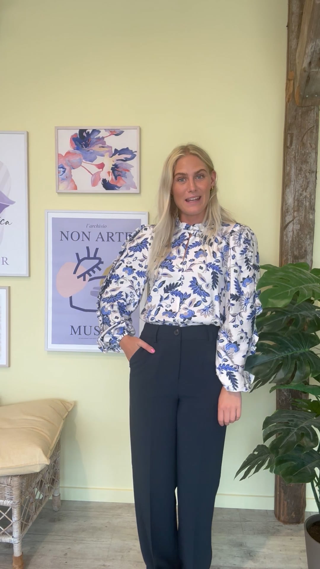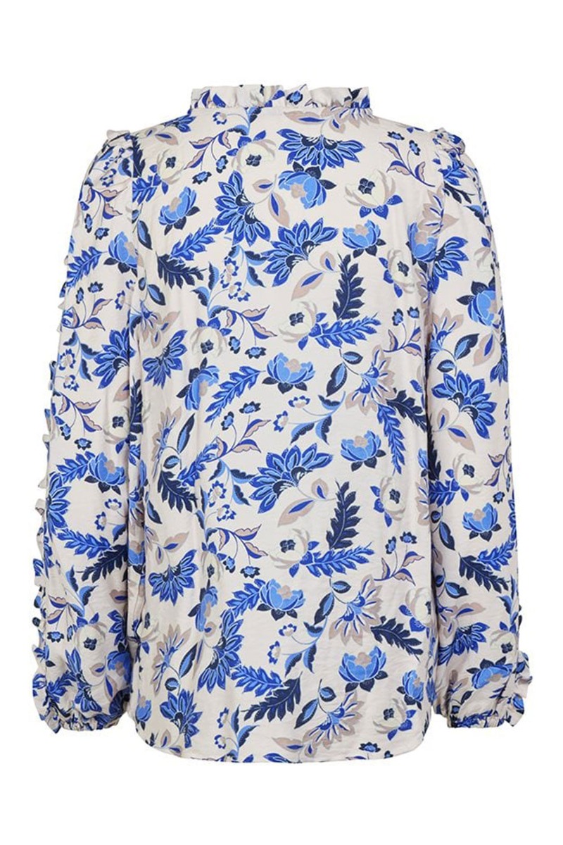 En fin bluse fra mbyM i blåt print på en hvid baggrund. Blusen har flæse detaljer ved kraven og hele vejen fra skulder til håndled på ærmet. Derudover lukkes den lige foran med stofbetrukket knap, som danner en lille hul detalje ved brystet. Printet findes også i smuk kjole.